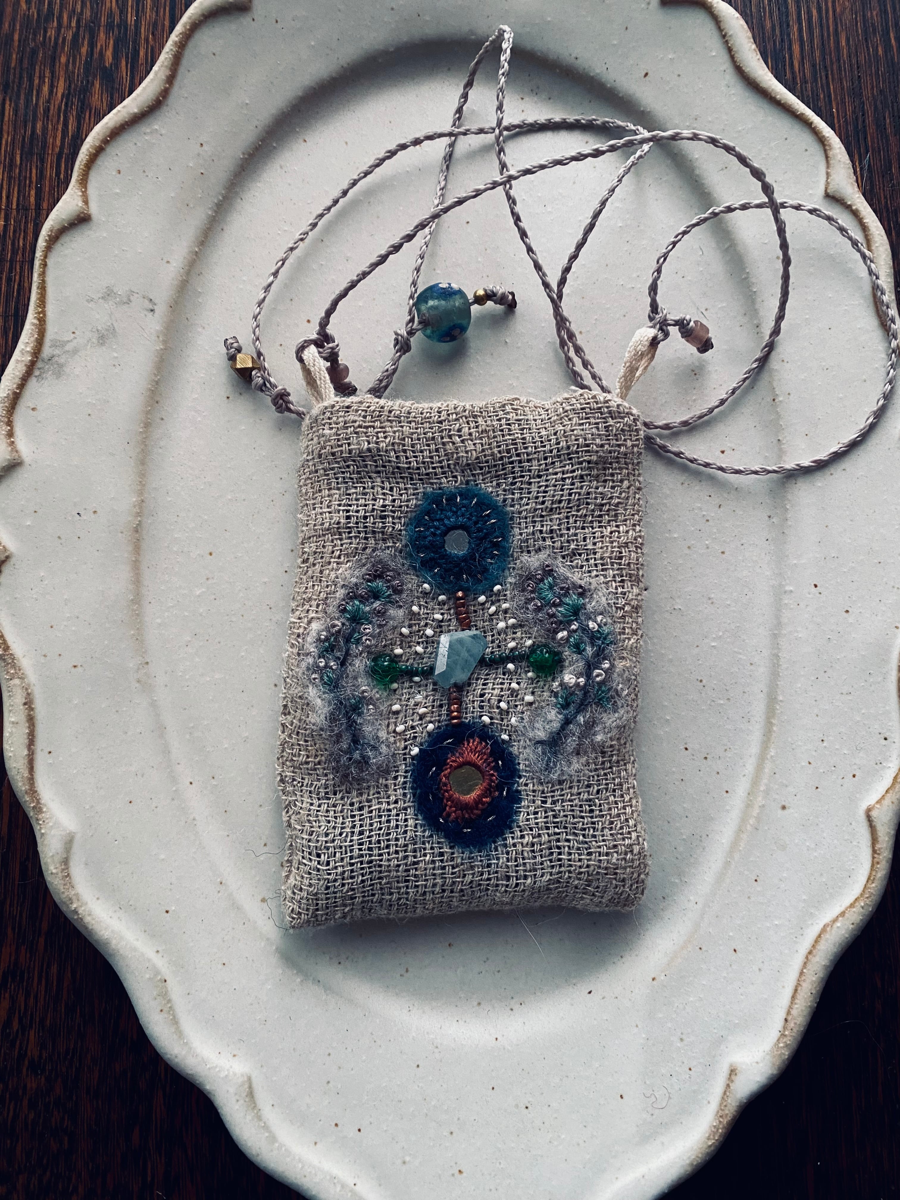 ウールとミラー刺繍のペンダント・ブルー