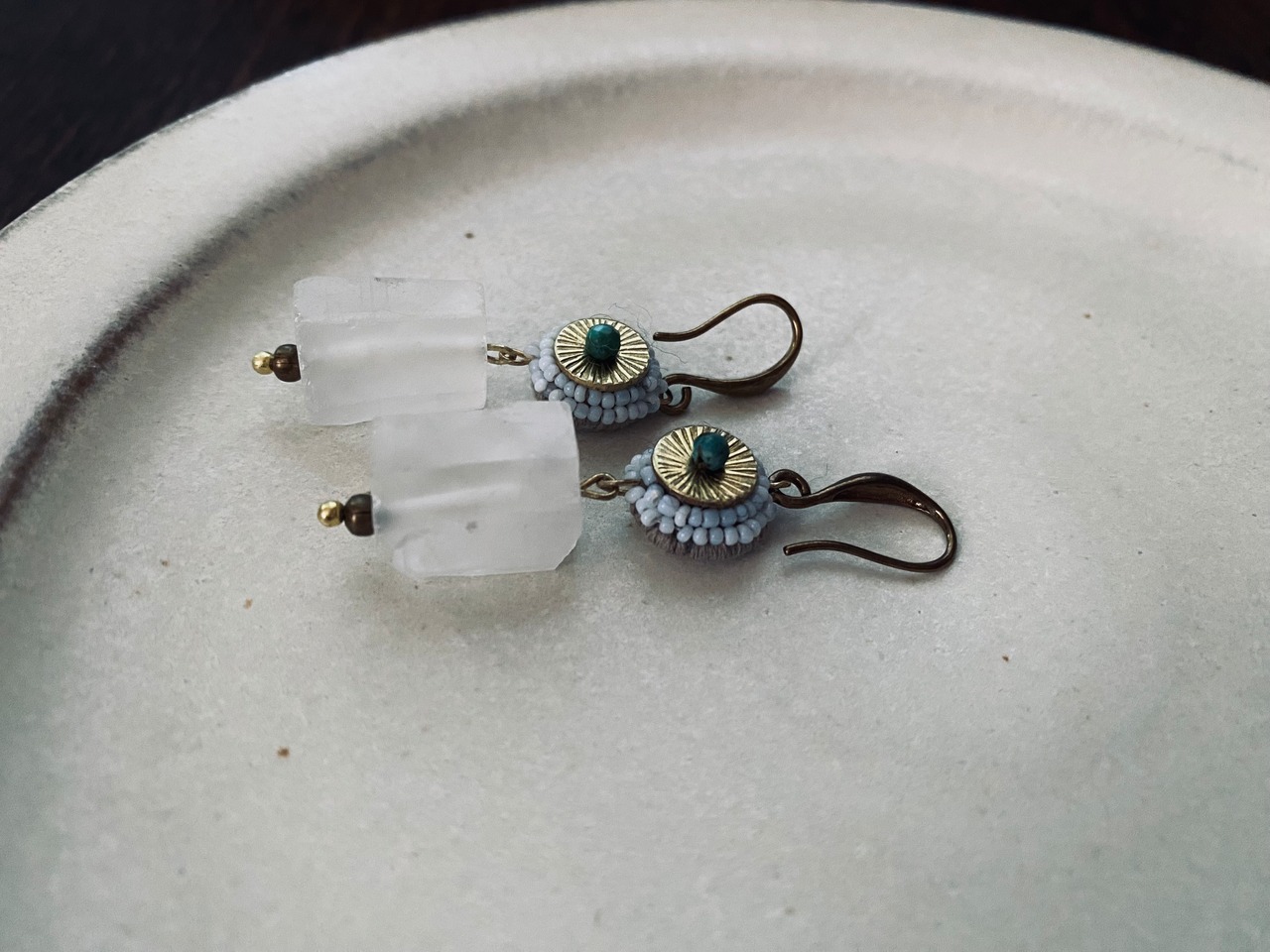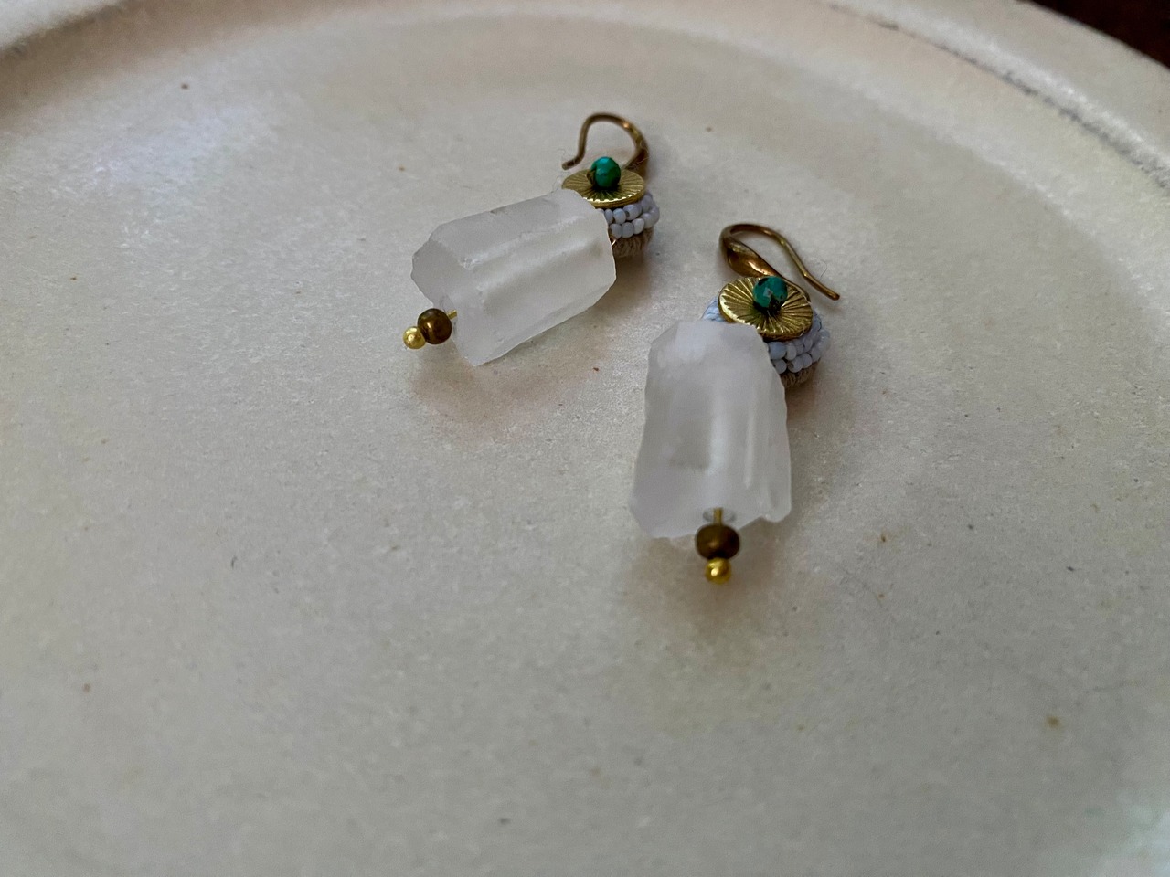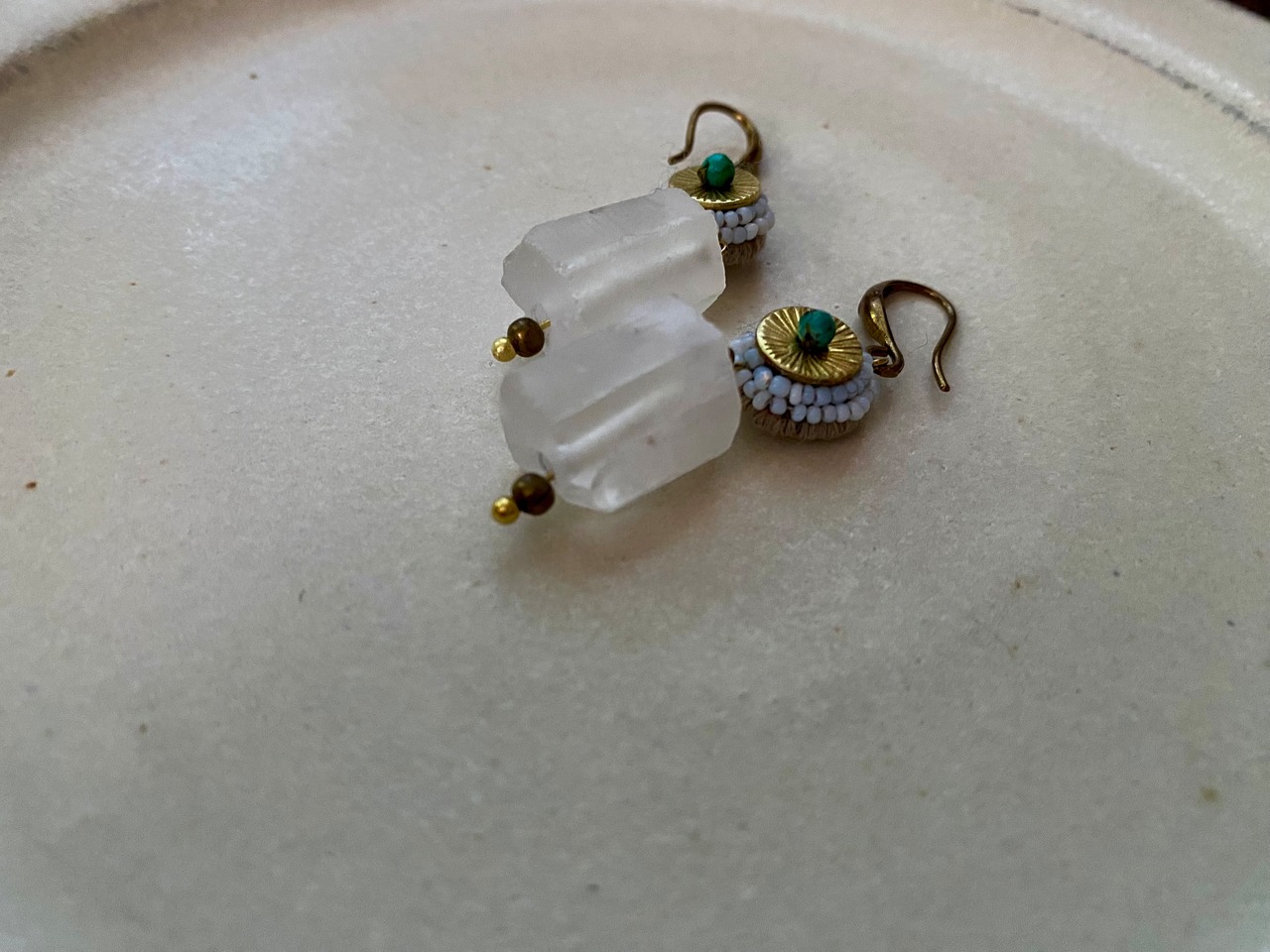 水晶、トルコ石、アンティークビーズ、インド真鍮金具、豚革、フェルト