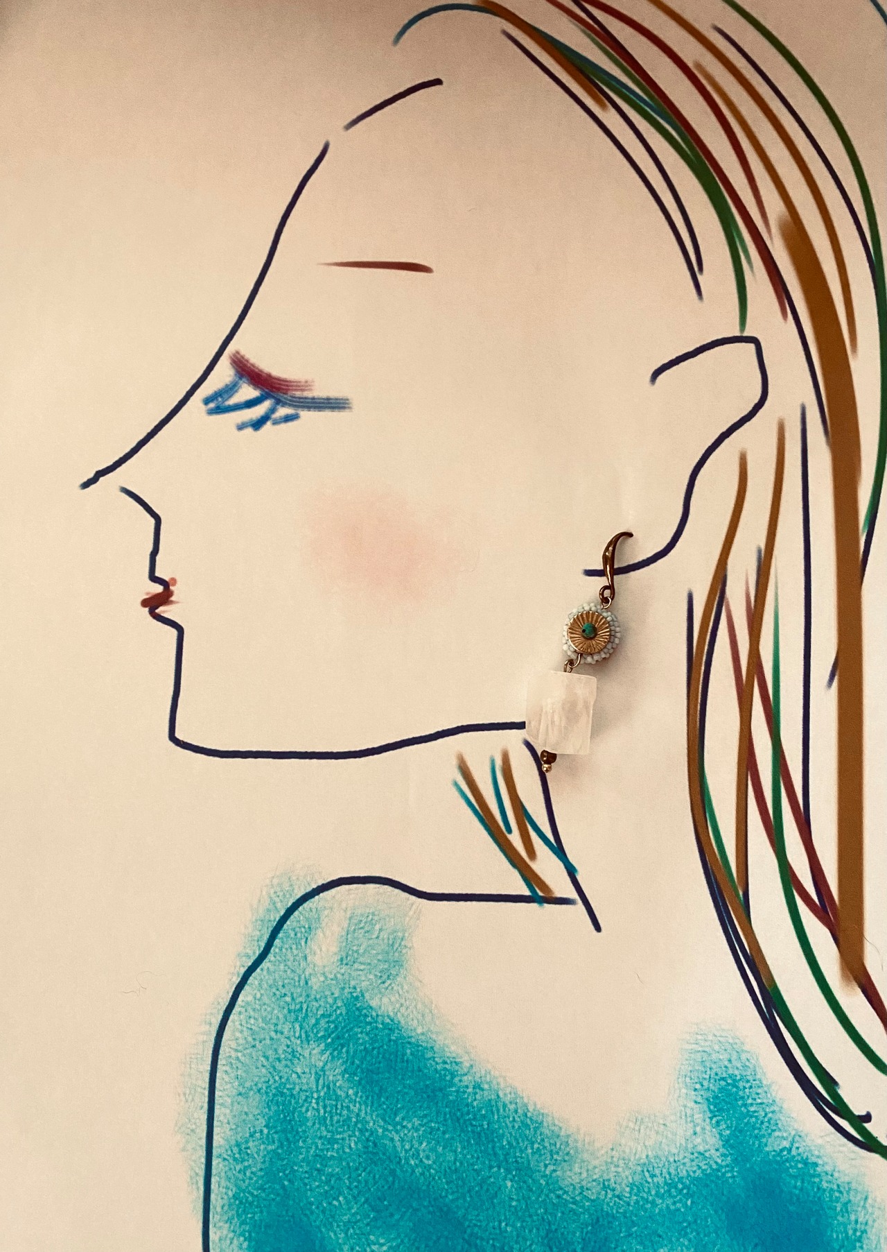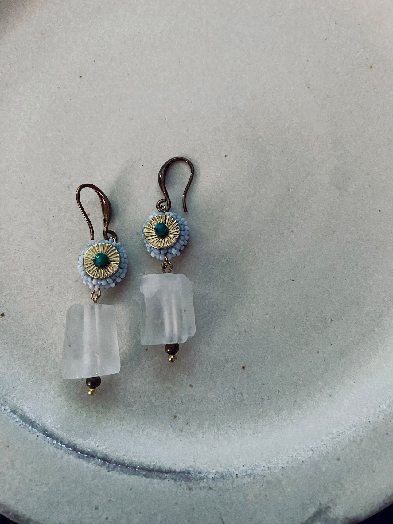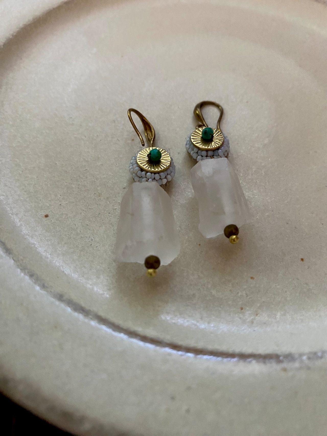 水晶、トルコ石、アンティークビーズ、インド真鍮金具、豚革、フェルト