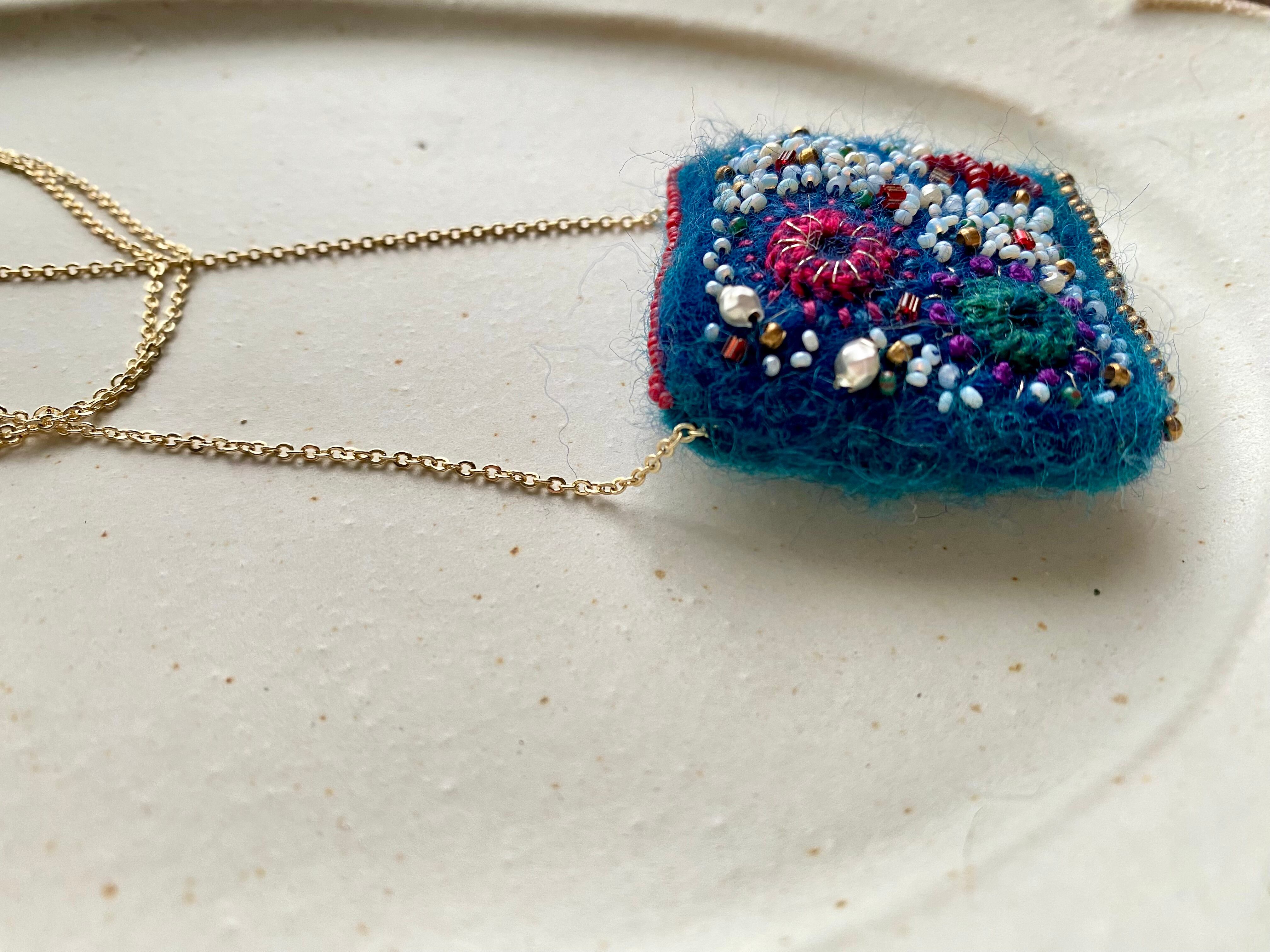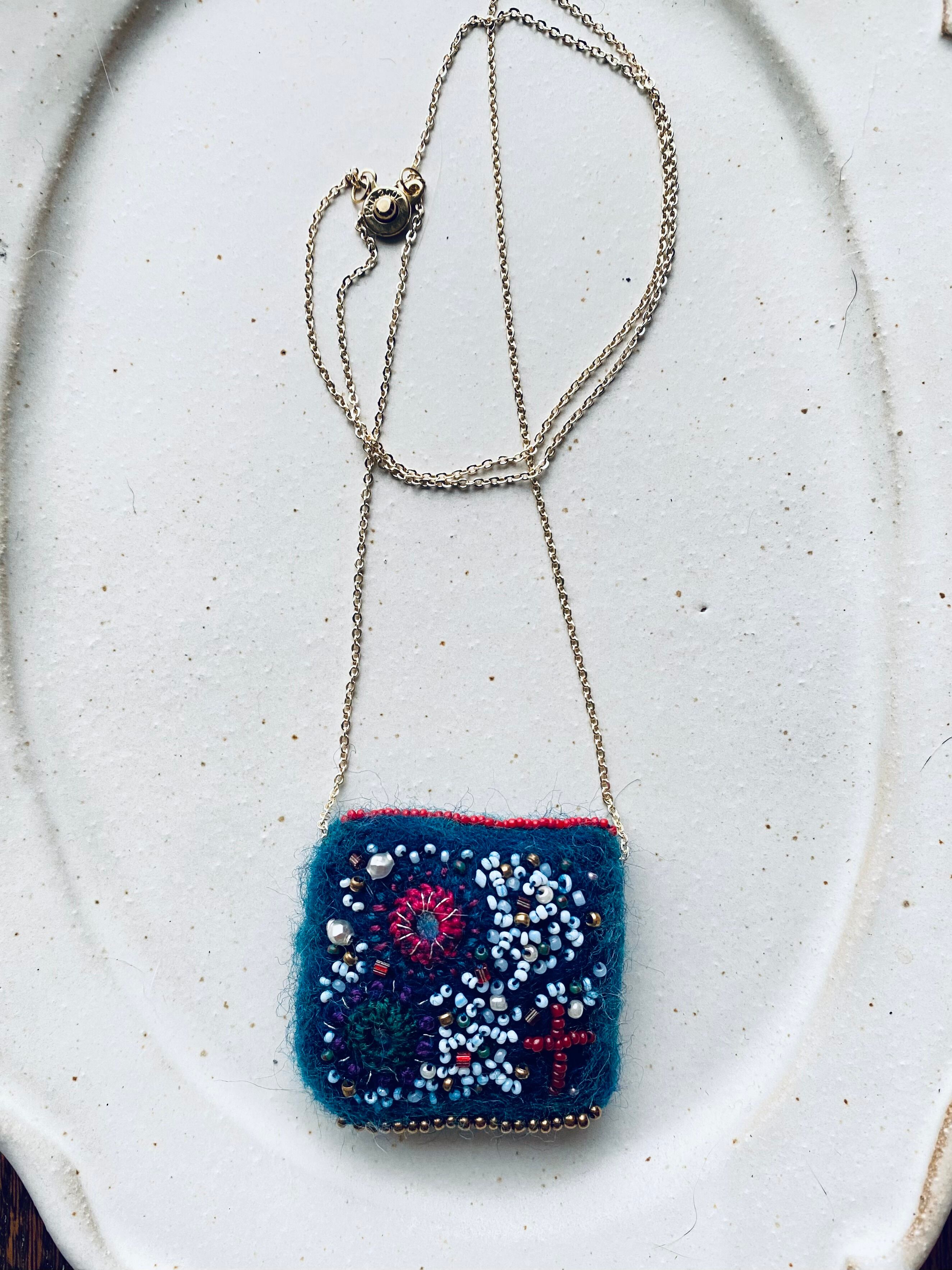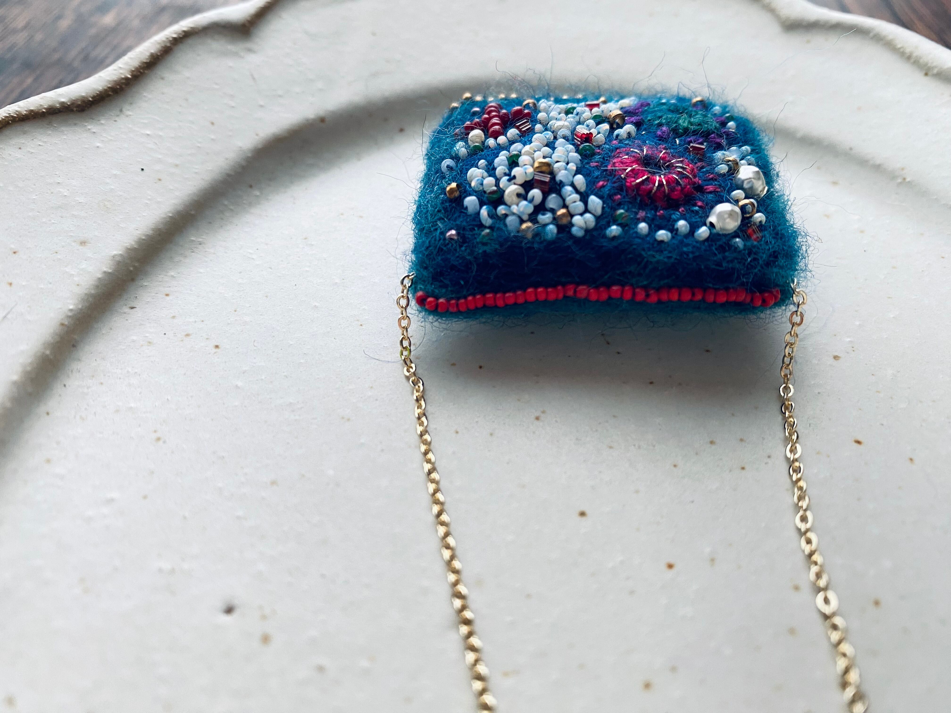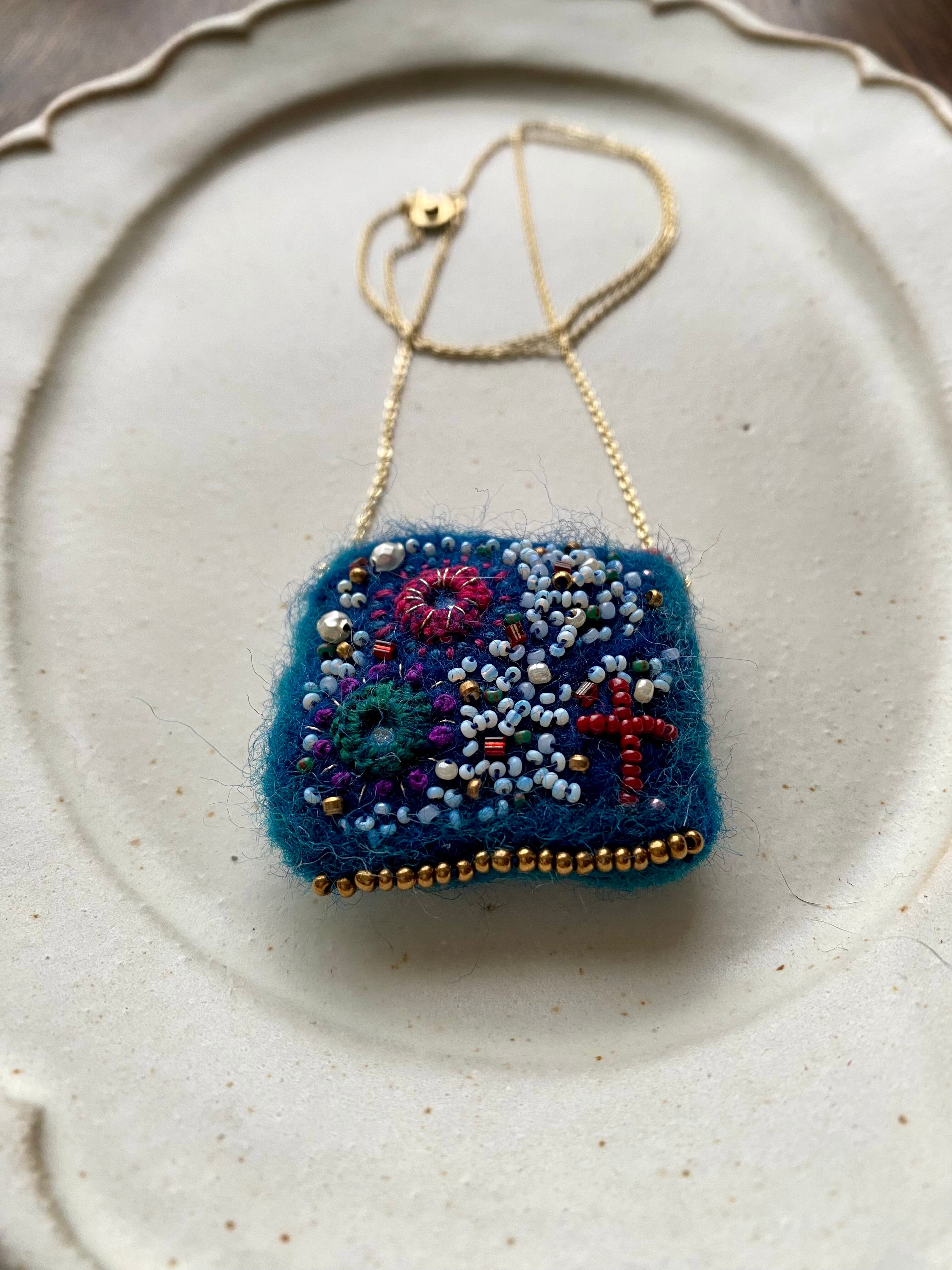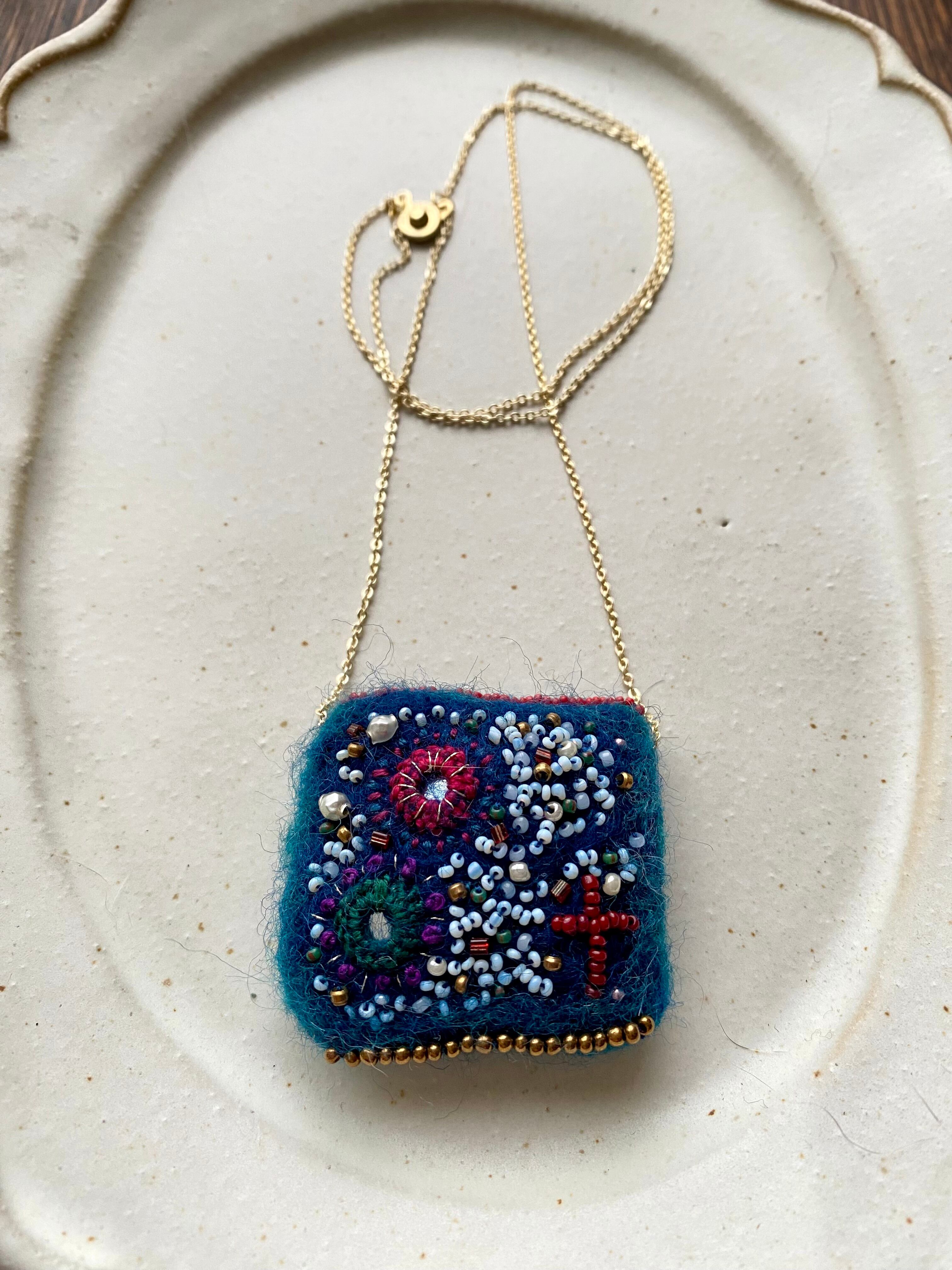 羊毛、ガラスビーズ、真鍮ビーズ、ミラー