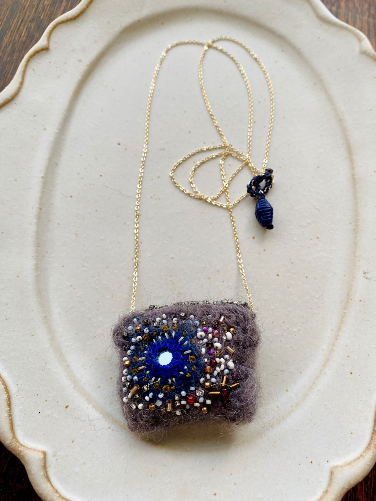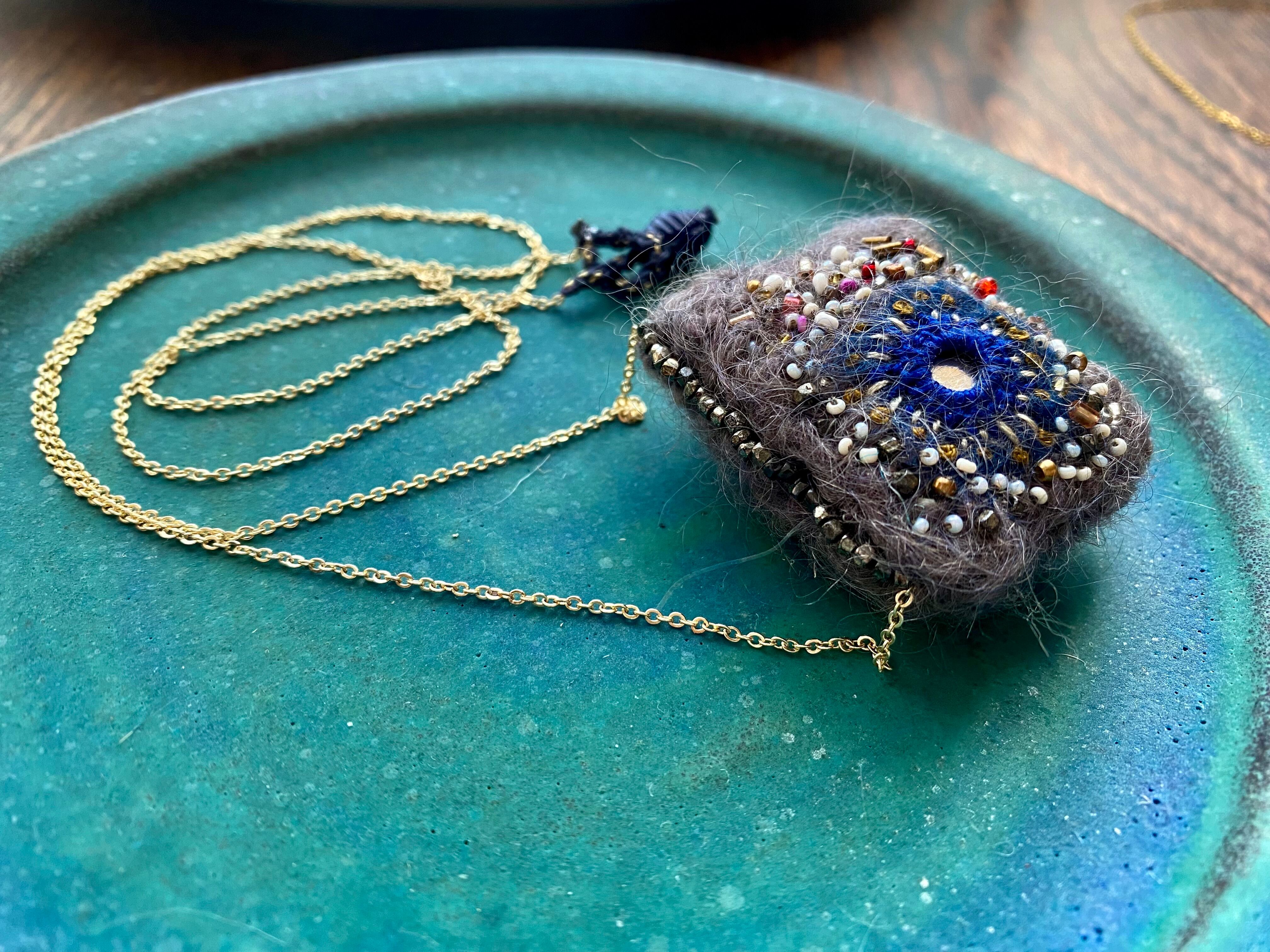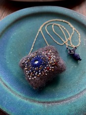 羊毛、ガラスビーズ、真鍮ビーズ、ミラー、