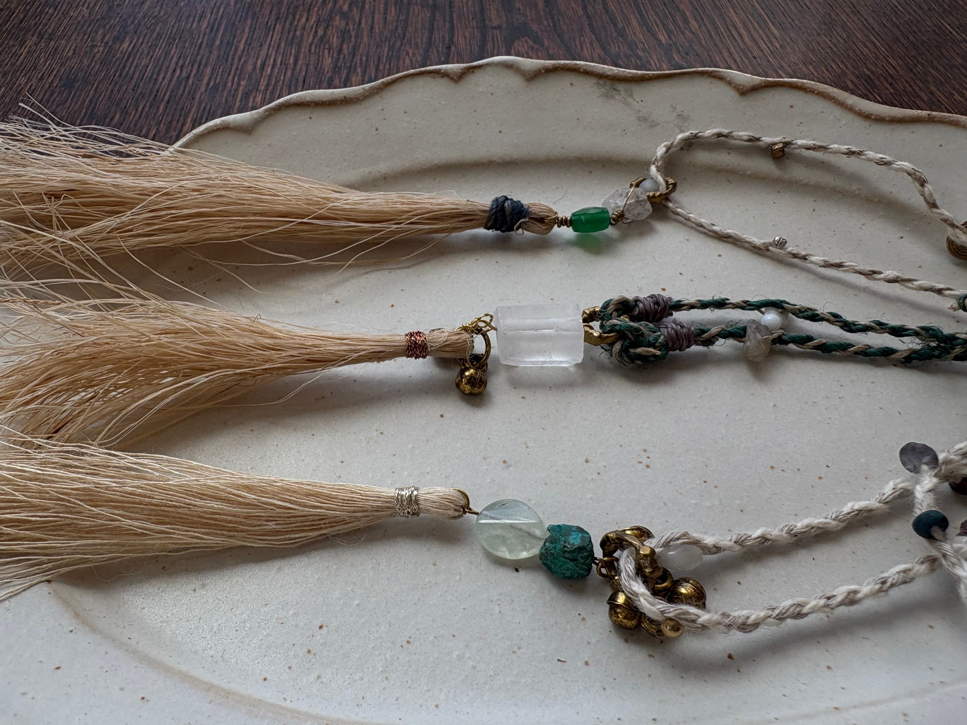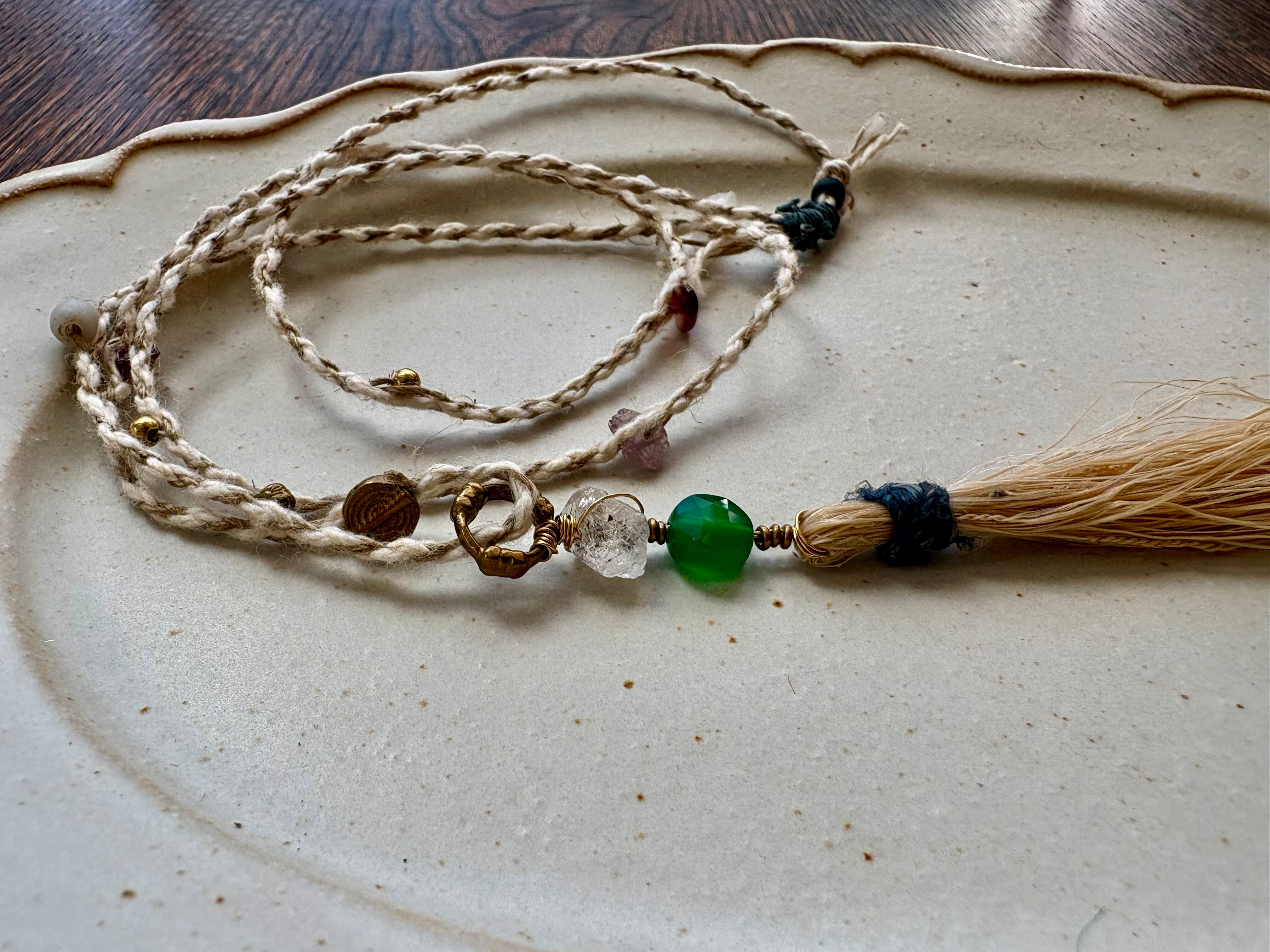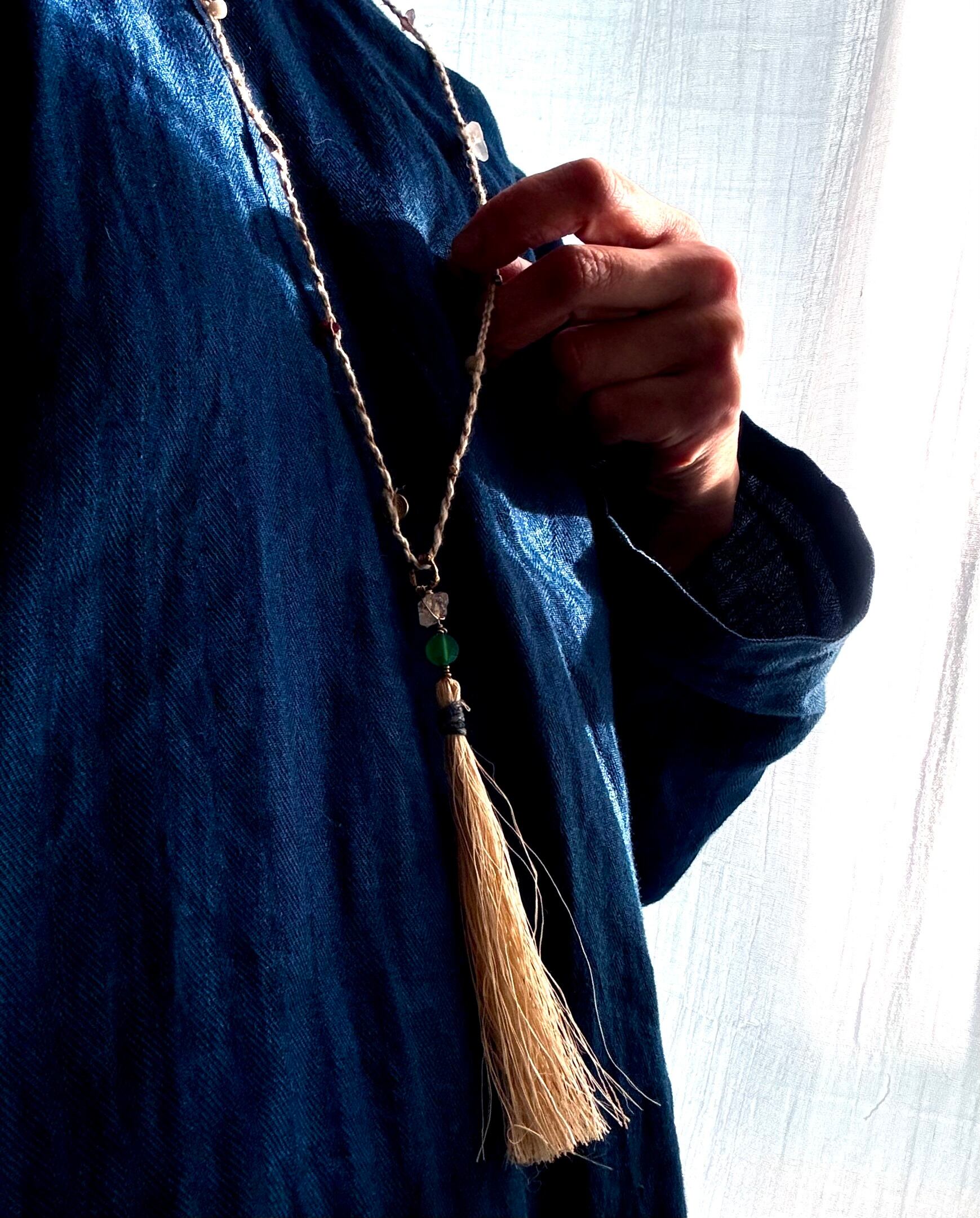 グラファイトの入ったダブルポイントクリスタルと星のようなカットのグリーンオニキスを繋げた、苧麻のタッセルのネックレス。