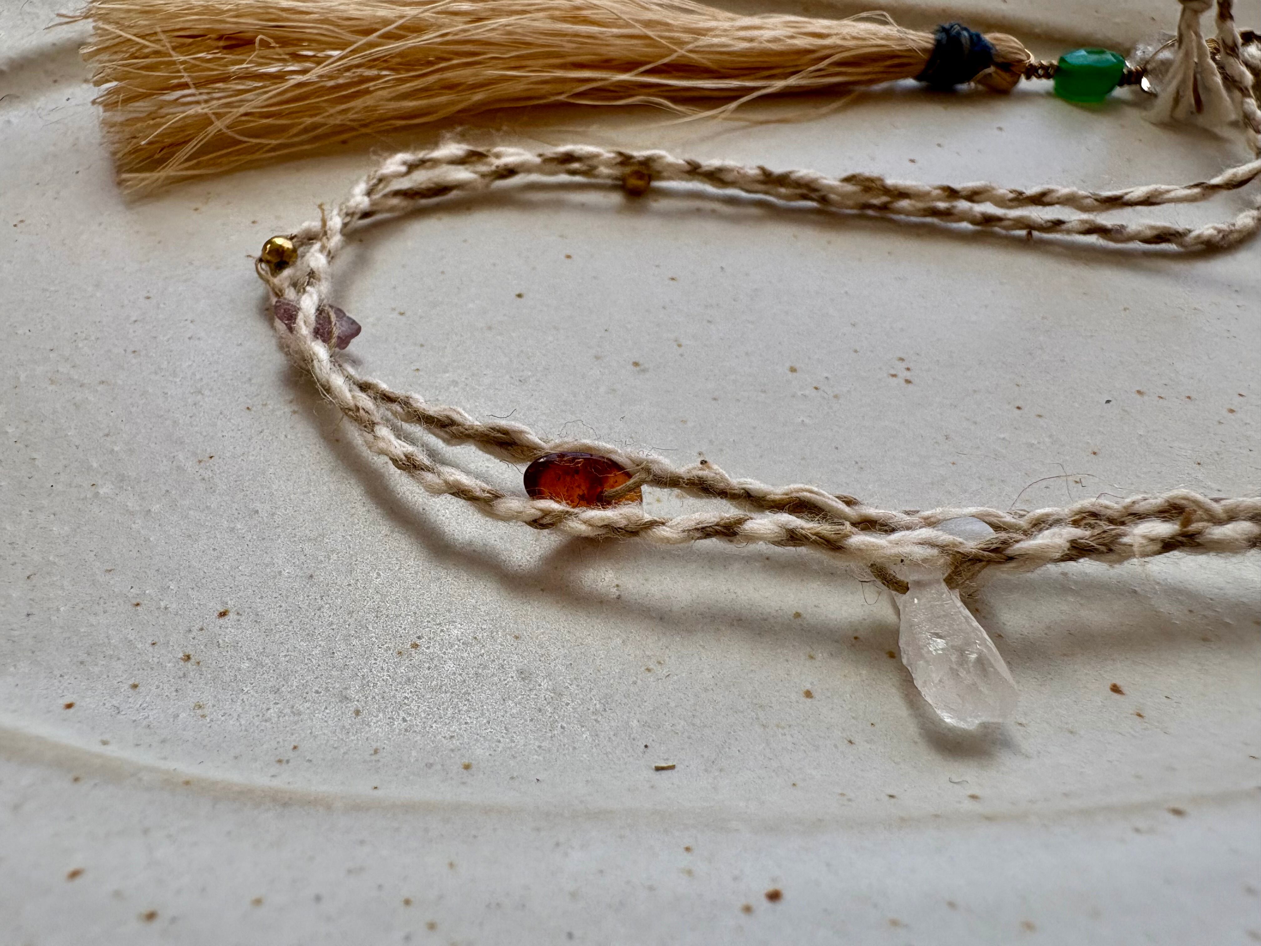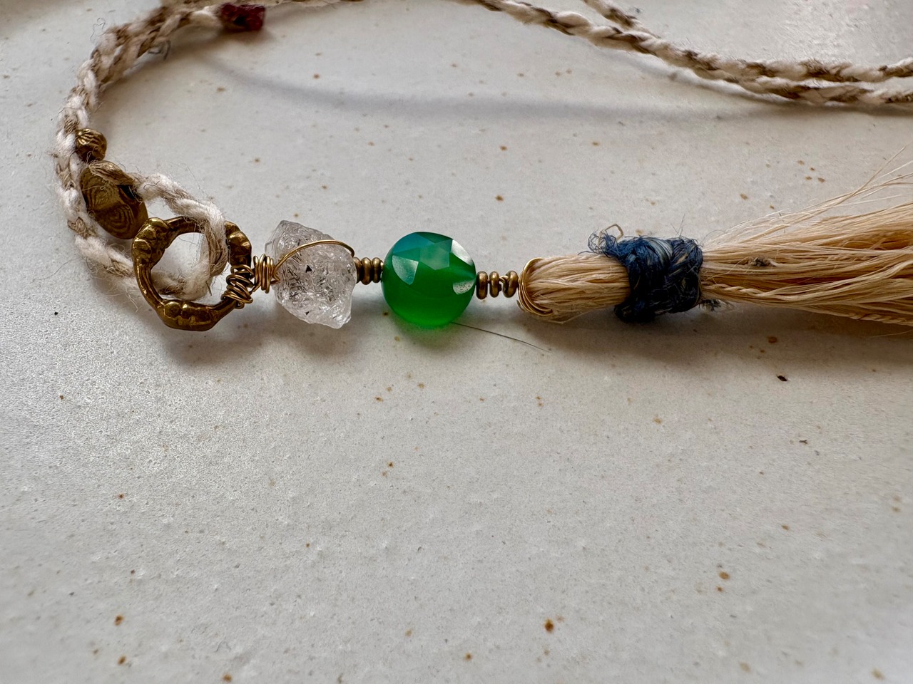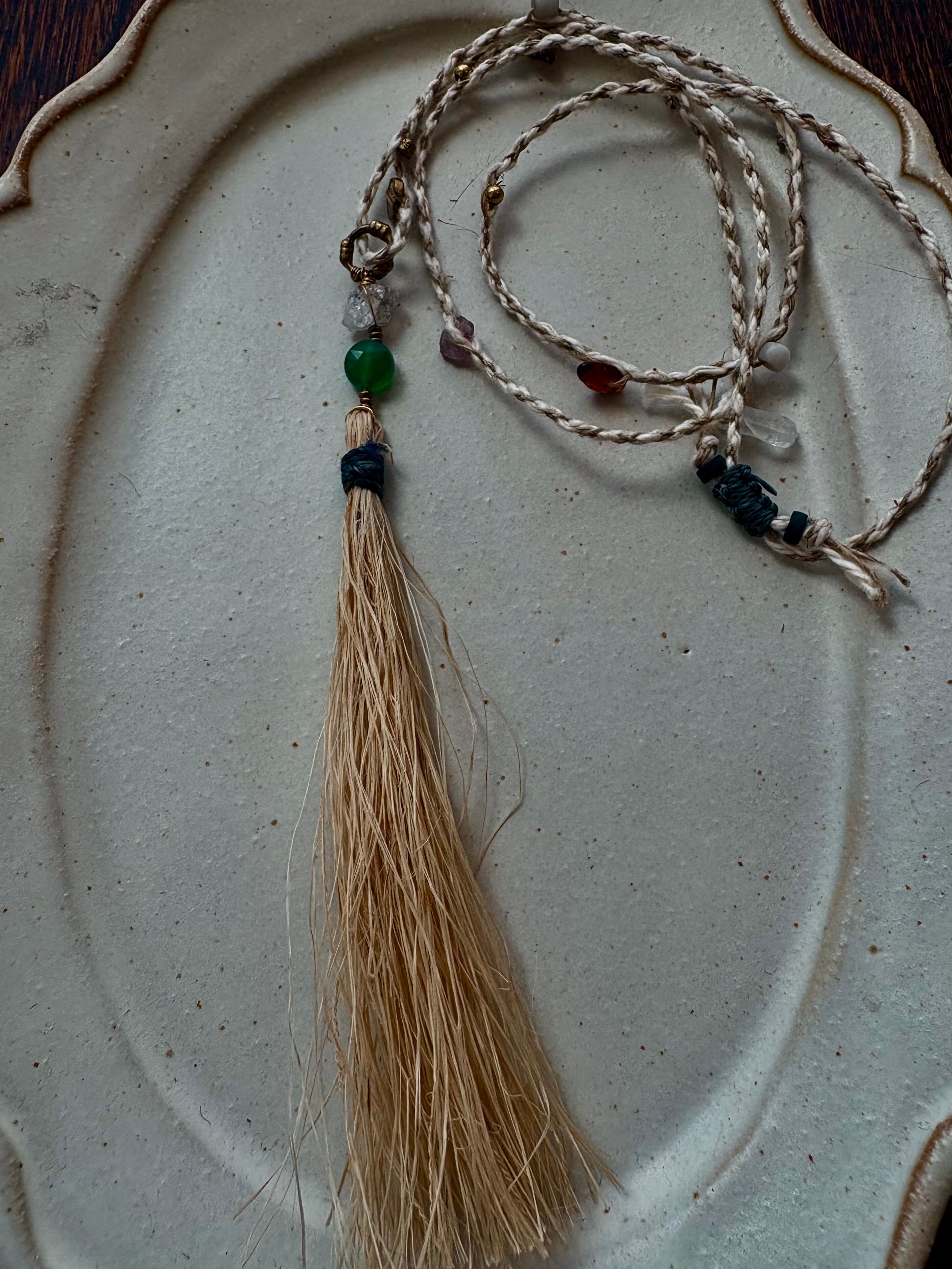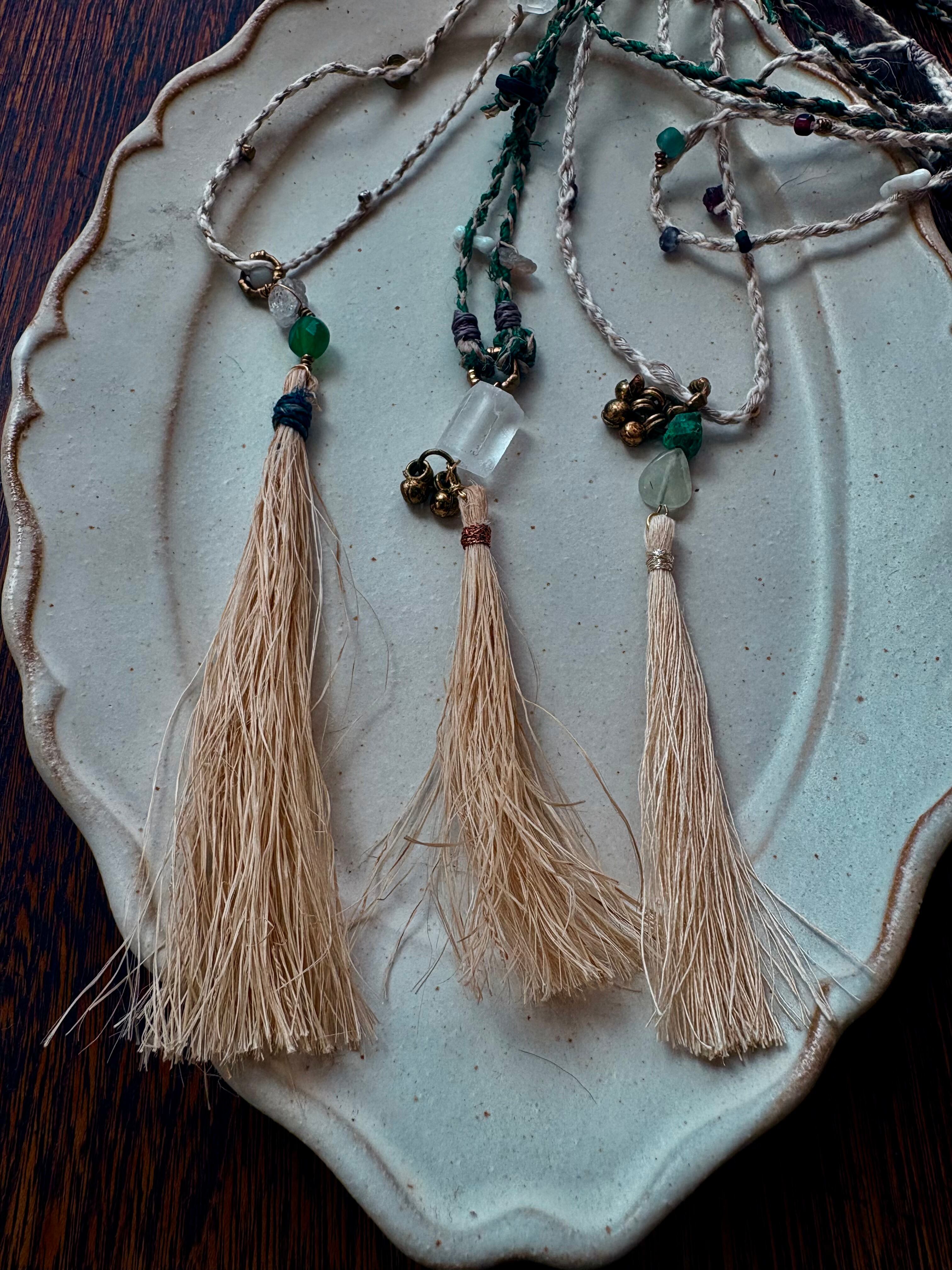 グラファイトの入ったダブルポイントクリスタルと星のようなカットのグリーンオニキスを繋げた、苧麻のタッセルのネックレス。
