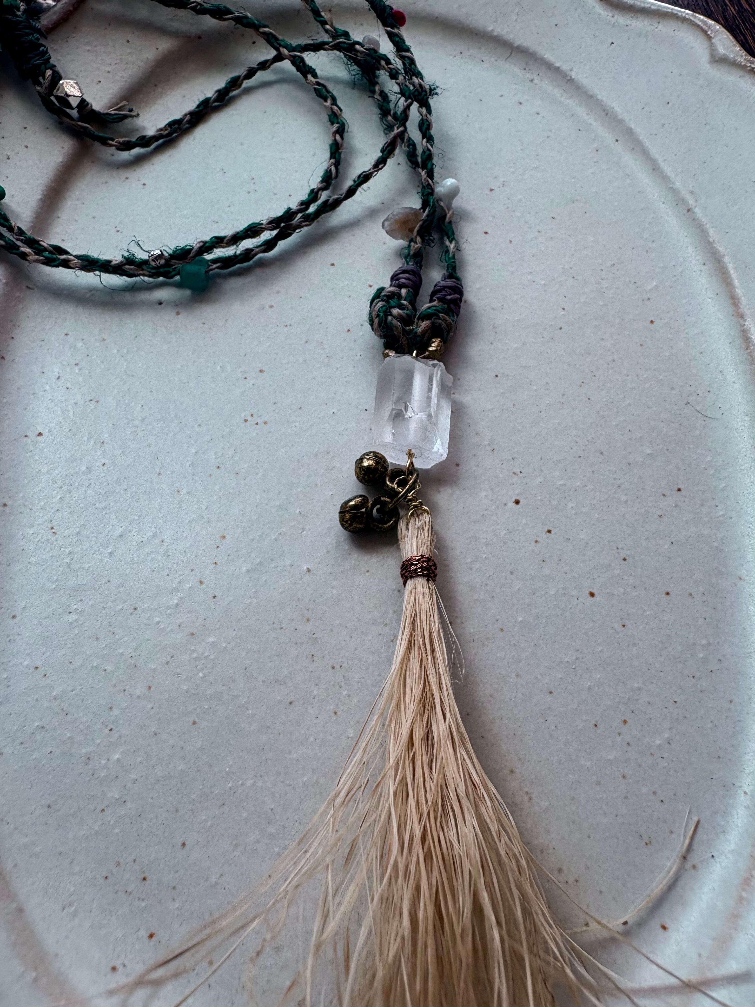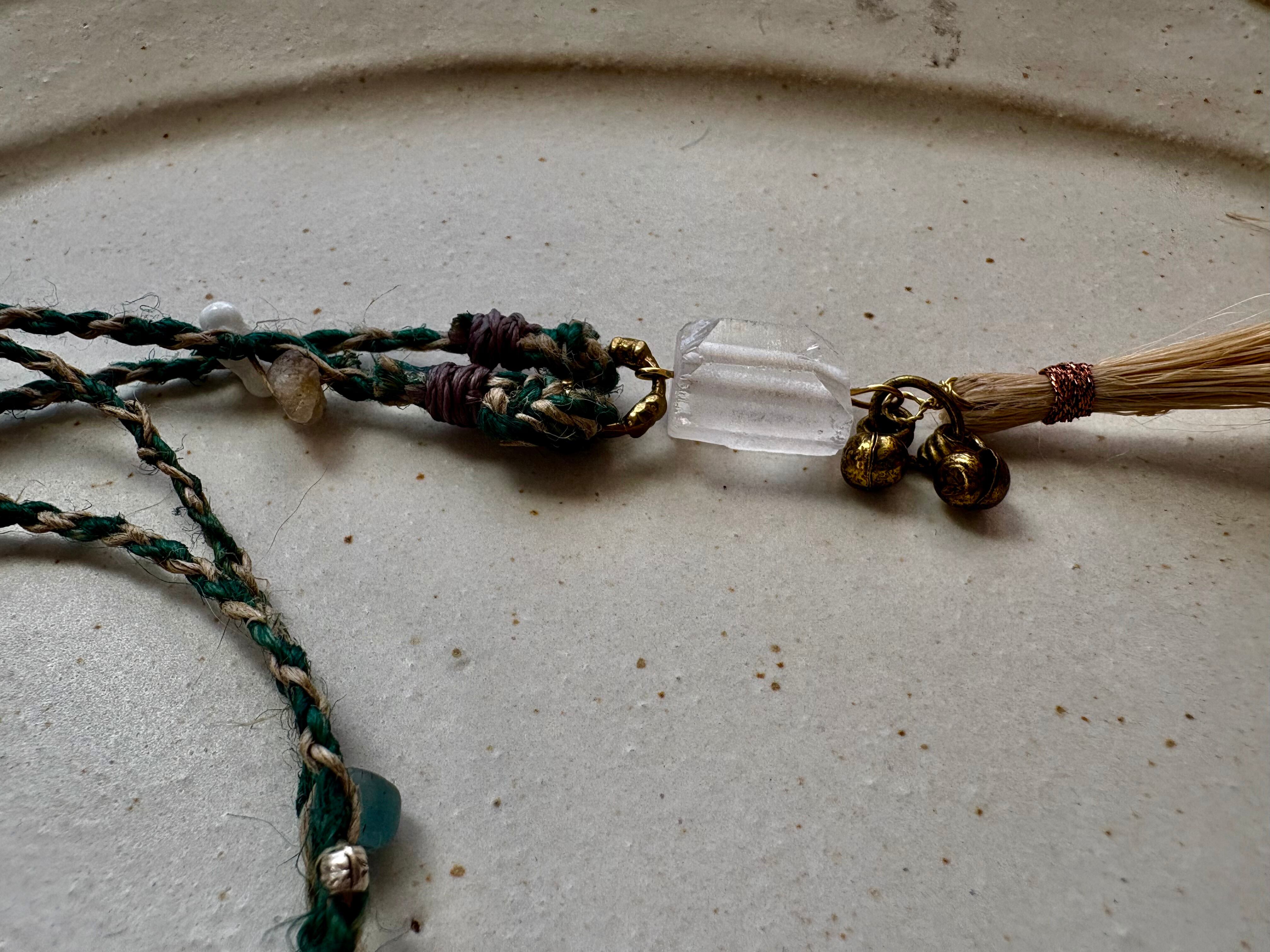 原石のままの大粒の水晶を繋げた、苧麻のタッセルのネックレス。