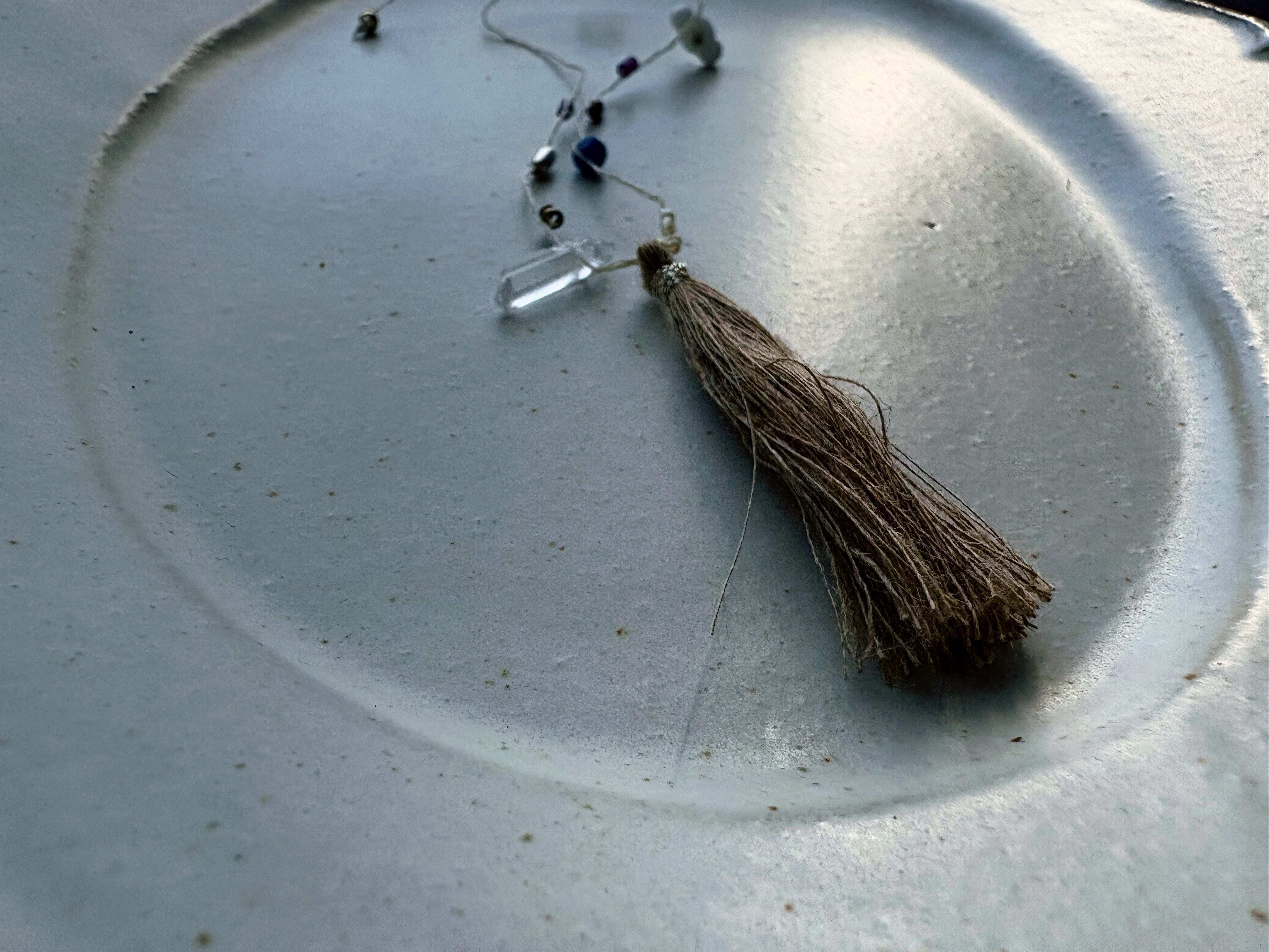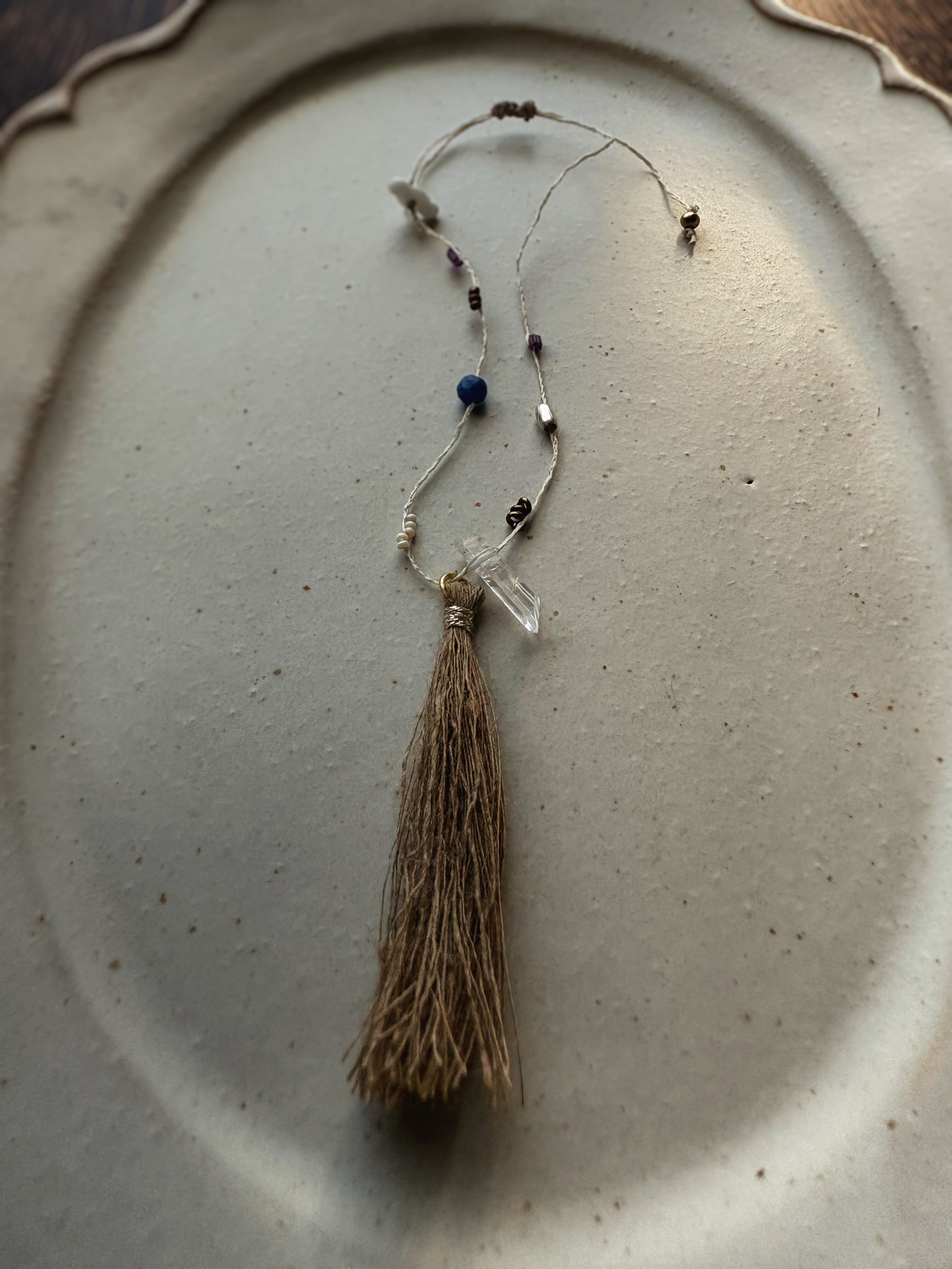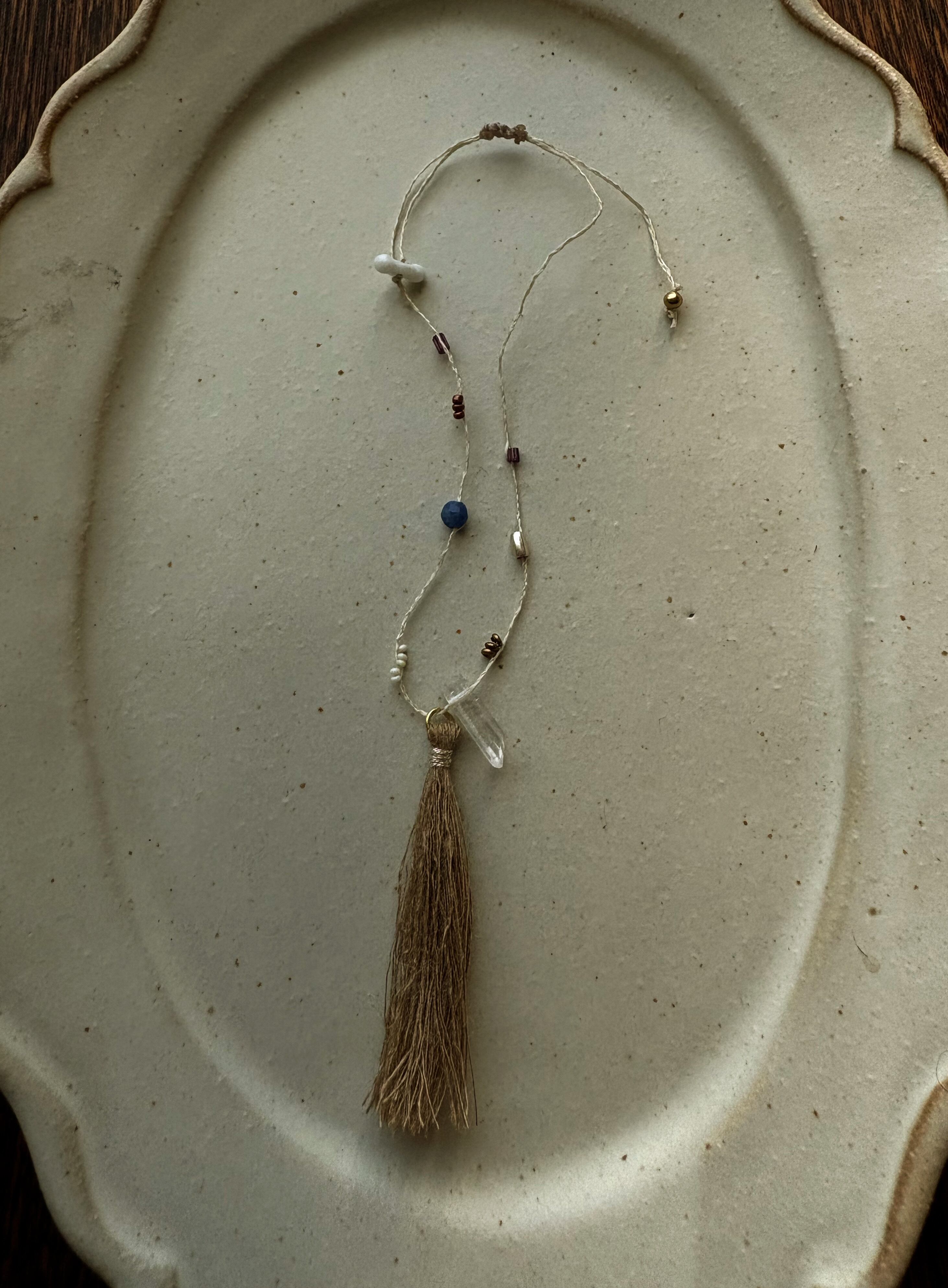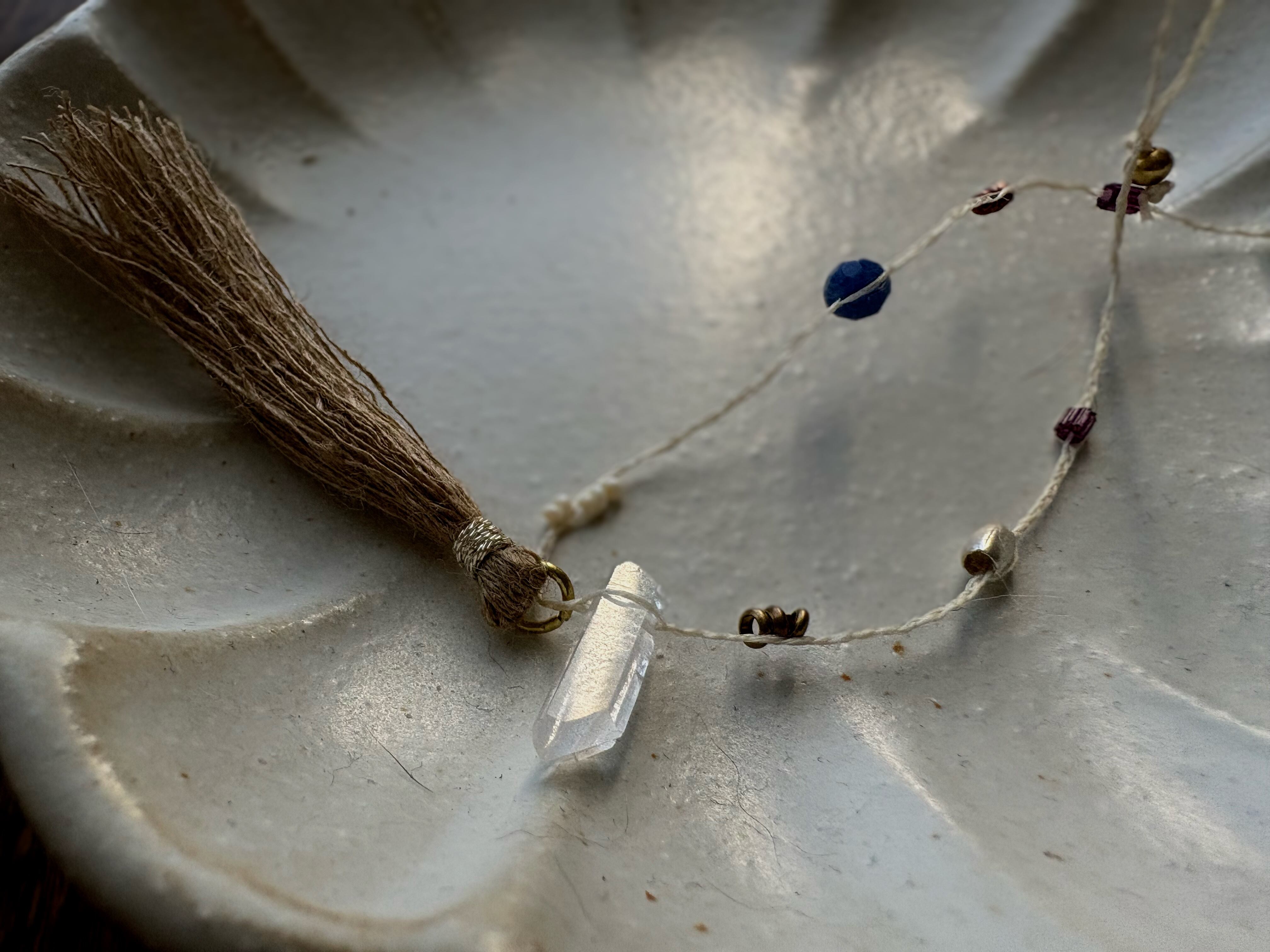 苧麻、絹糸、水晶、アンティークガラスビーズ、真鍮、カレンシルバー、蝋引き糸
