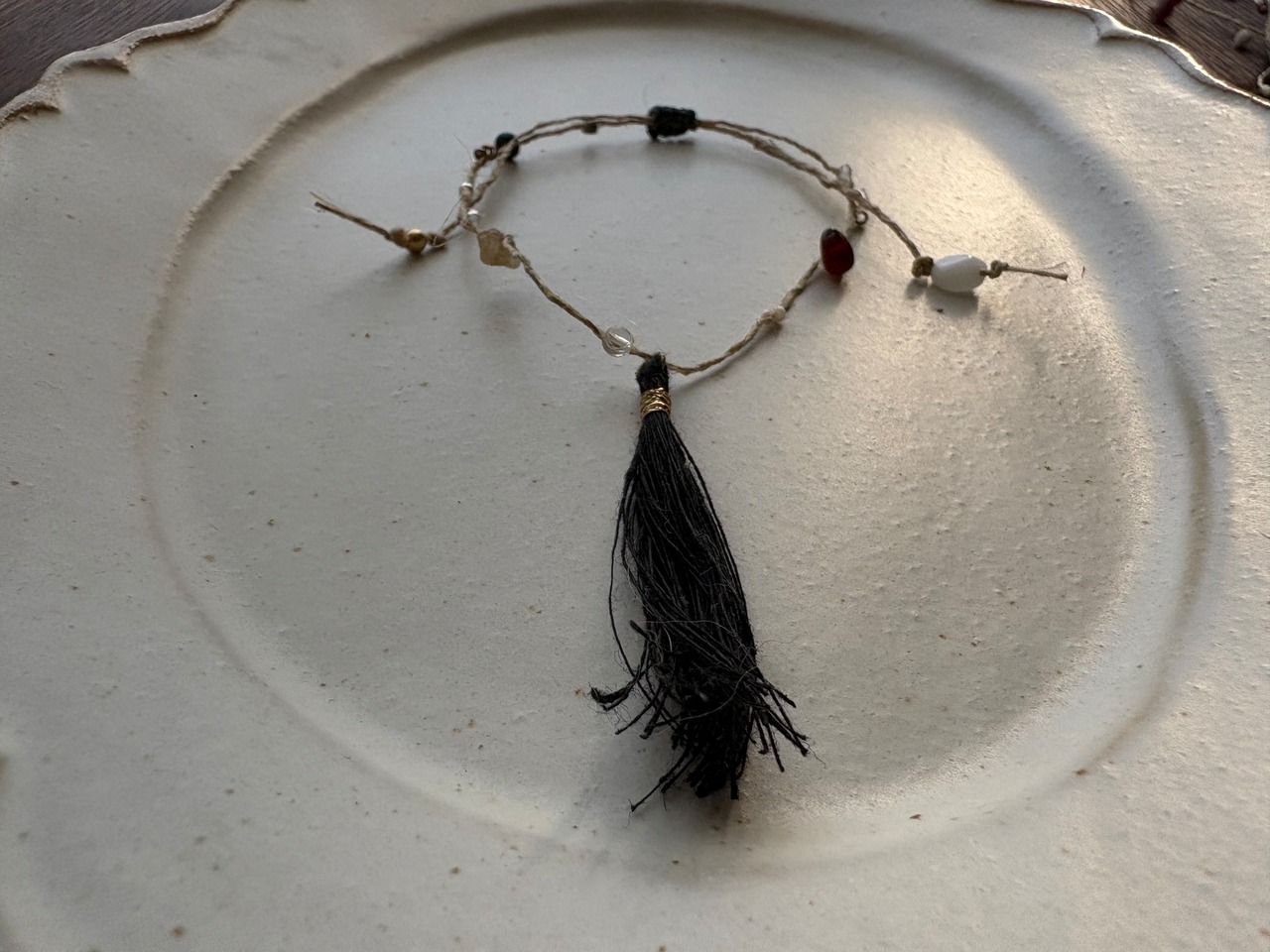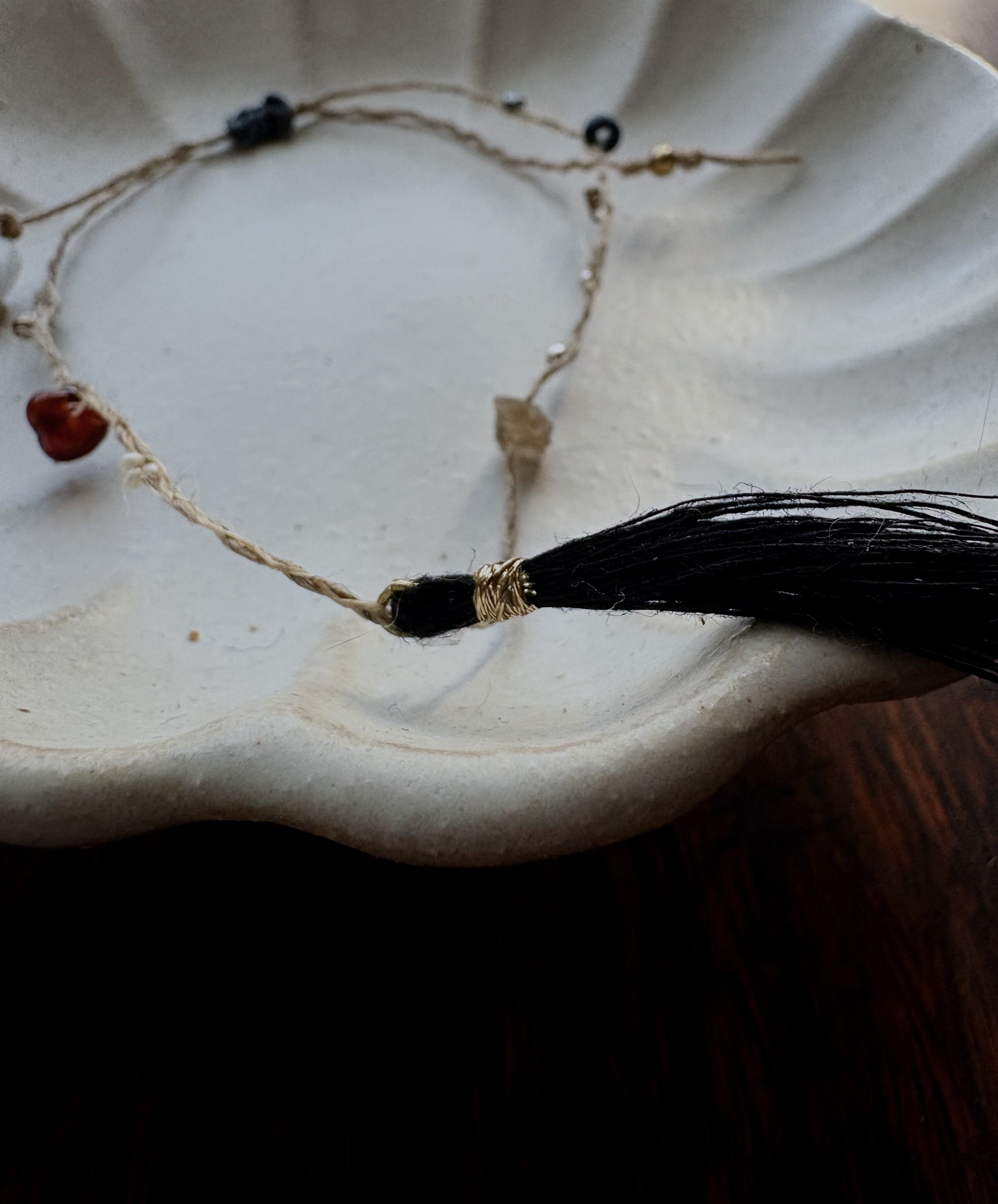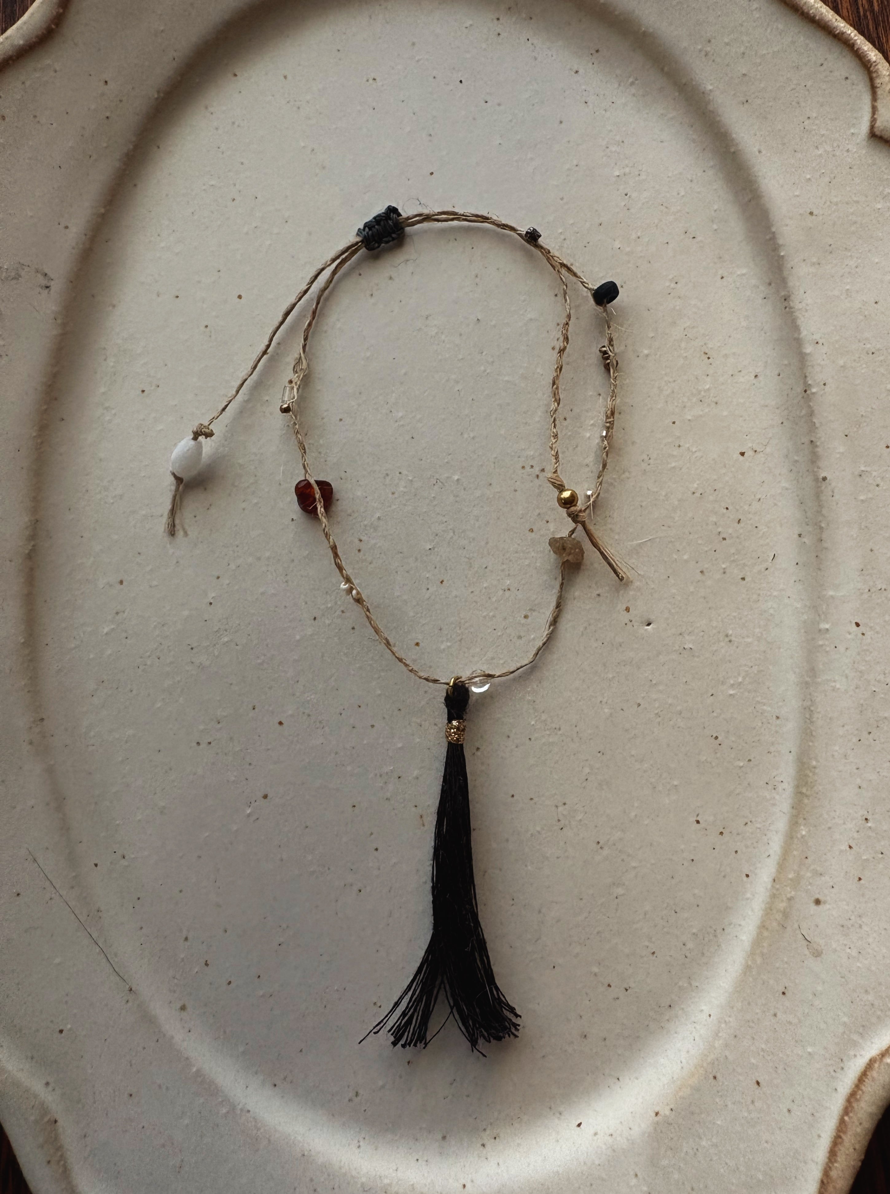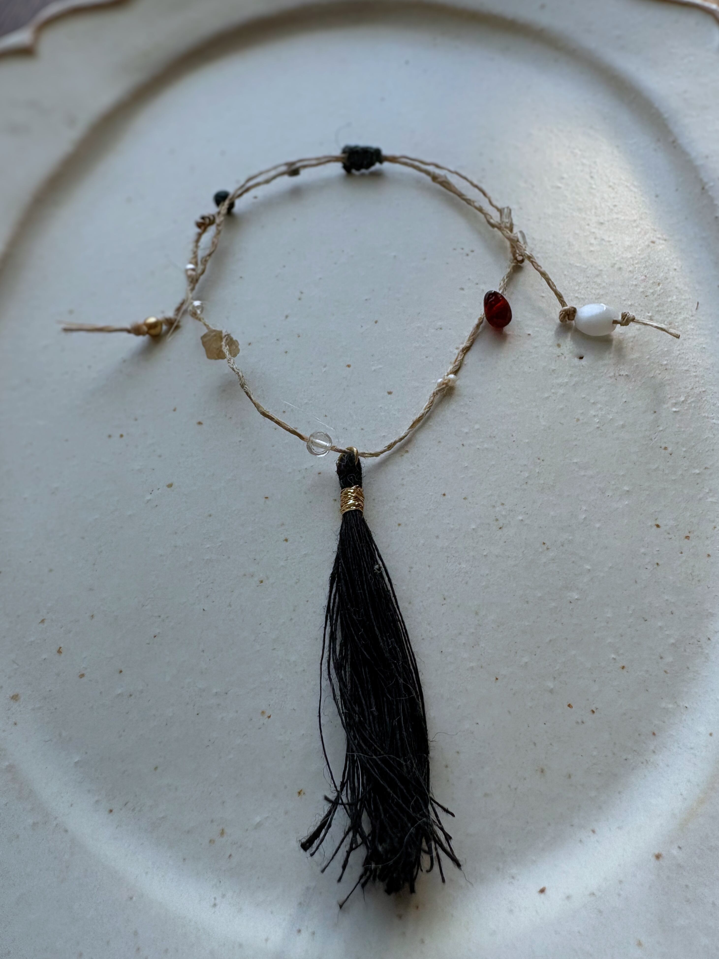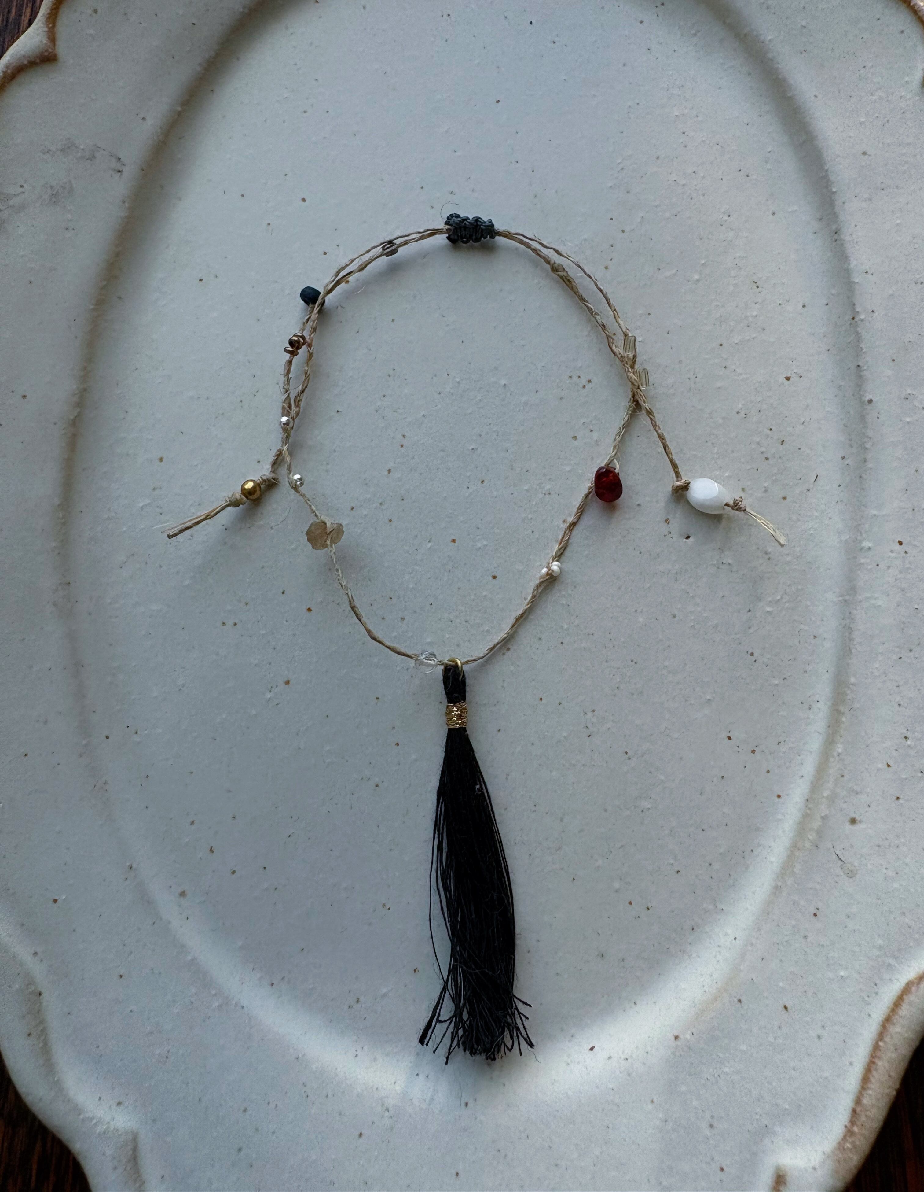 苧麻、絹糸、アンティークガラスビーズ、スピネル、ガーネット、真鍮、シルバー、藍染めウッドビーズ、蝋引き糸