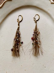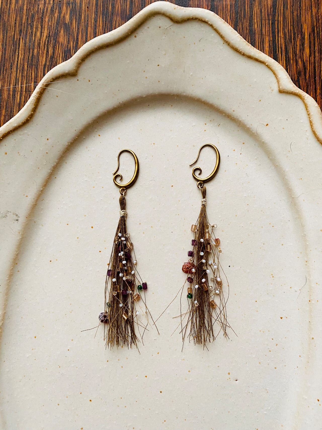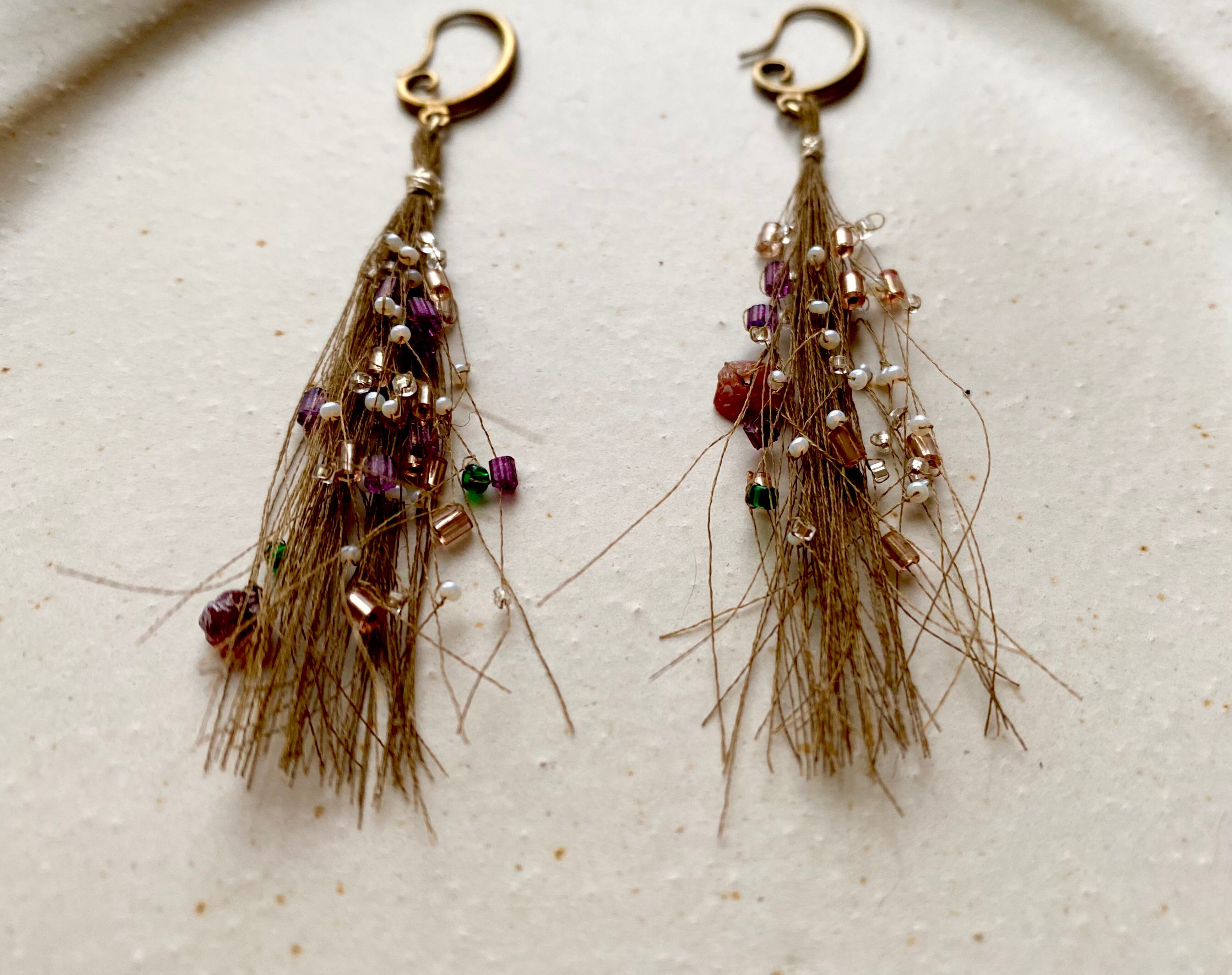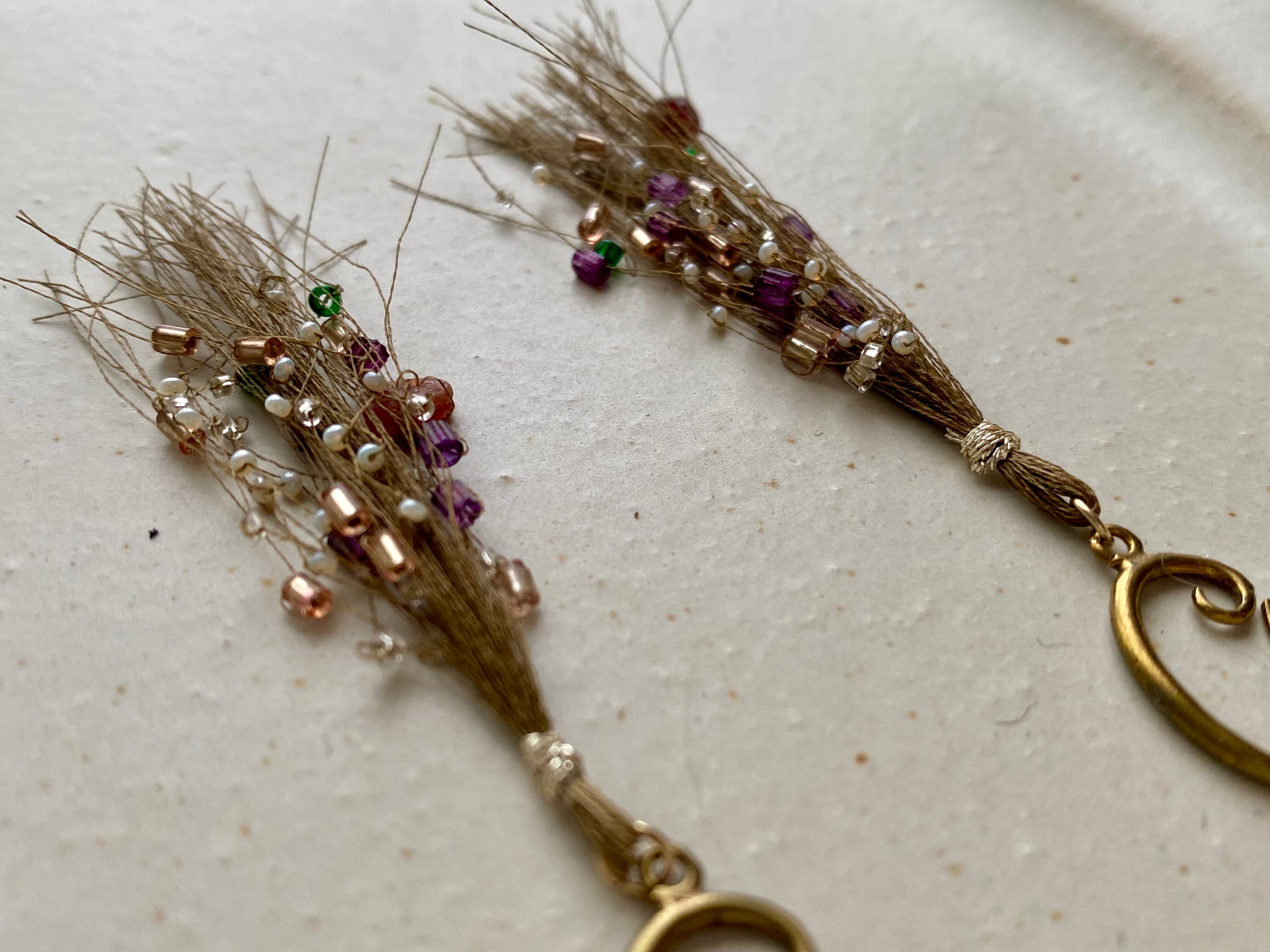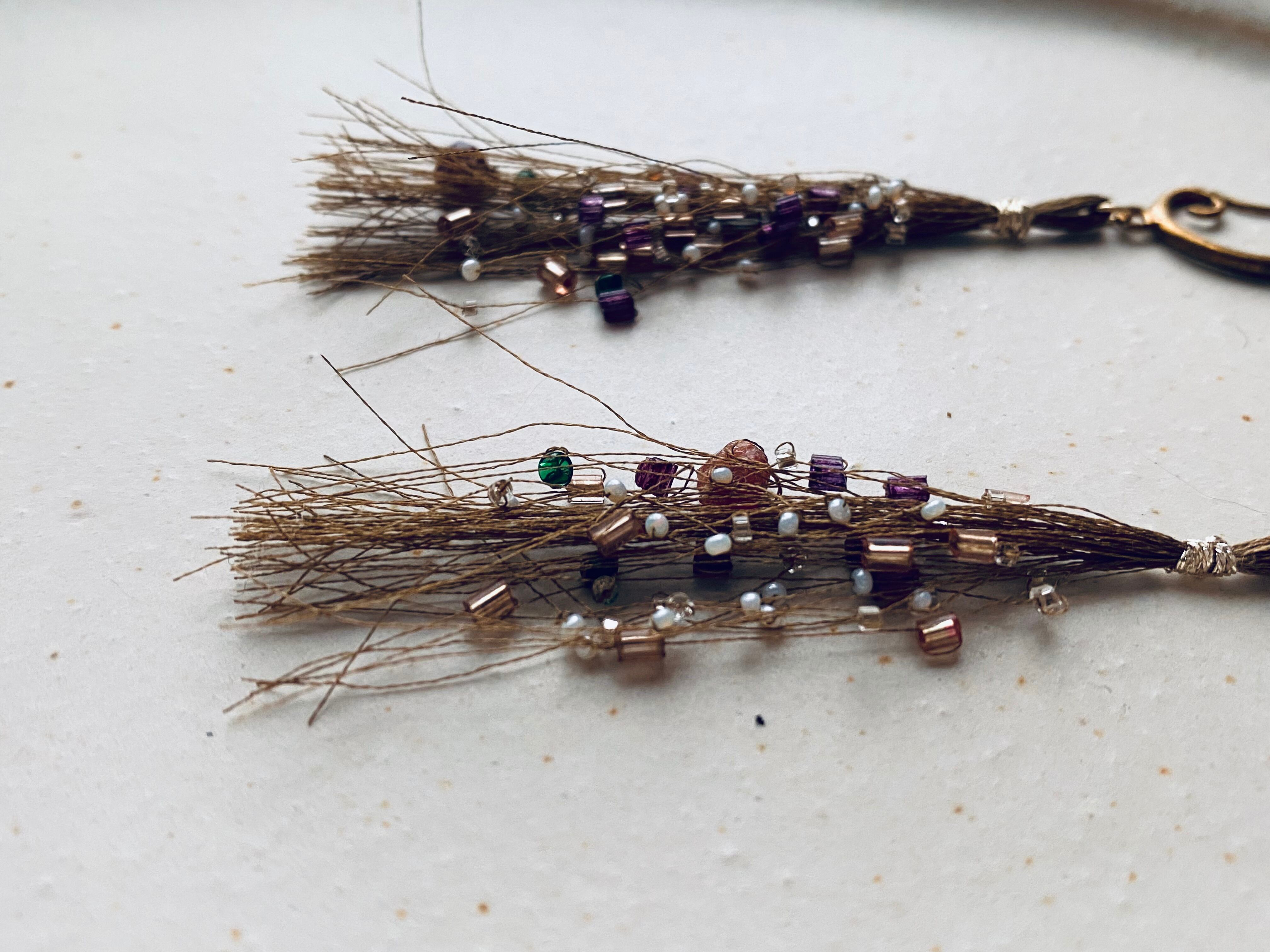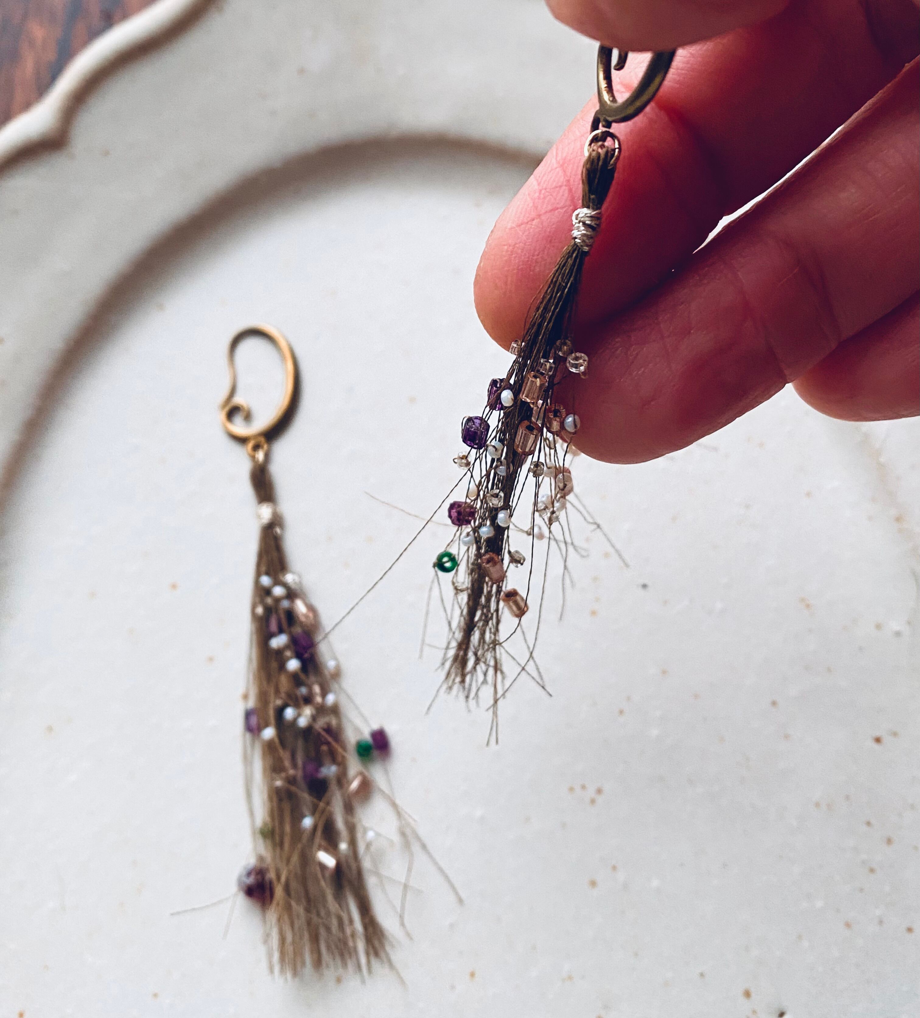 真木テキスタイルで手に入れた繊細な絹糸に、小さな古いビーズや鉱石をひとつずつ結びとめています。