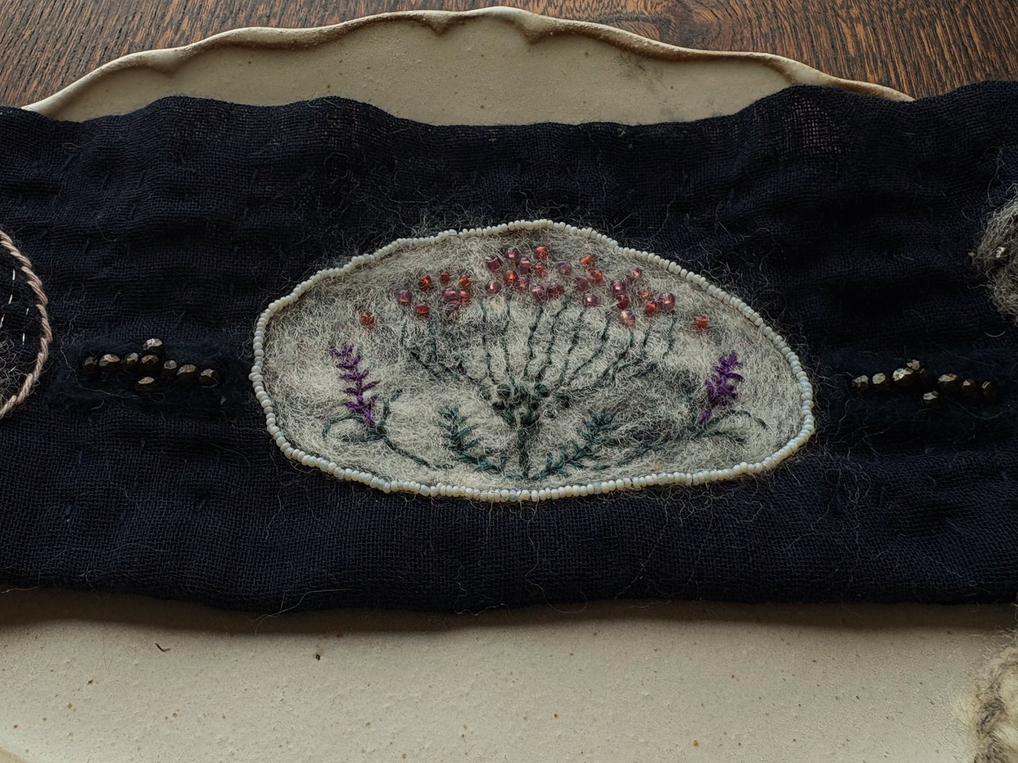 ゆったりしたワンピースにゆるやかに重ねたり。紐はウールとアクリル混の毛糸を、藍染めウッドビーズとともに編んだものです。