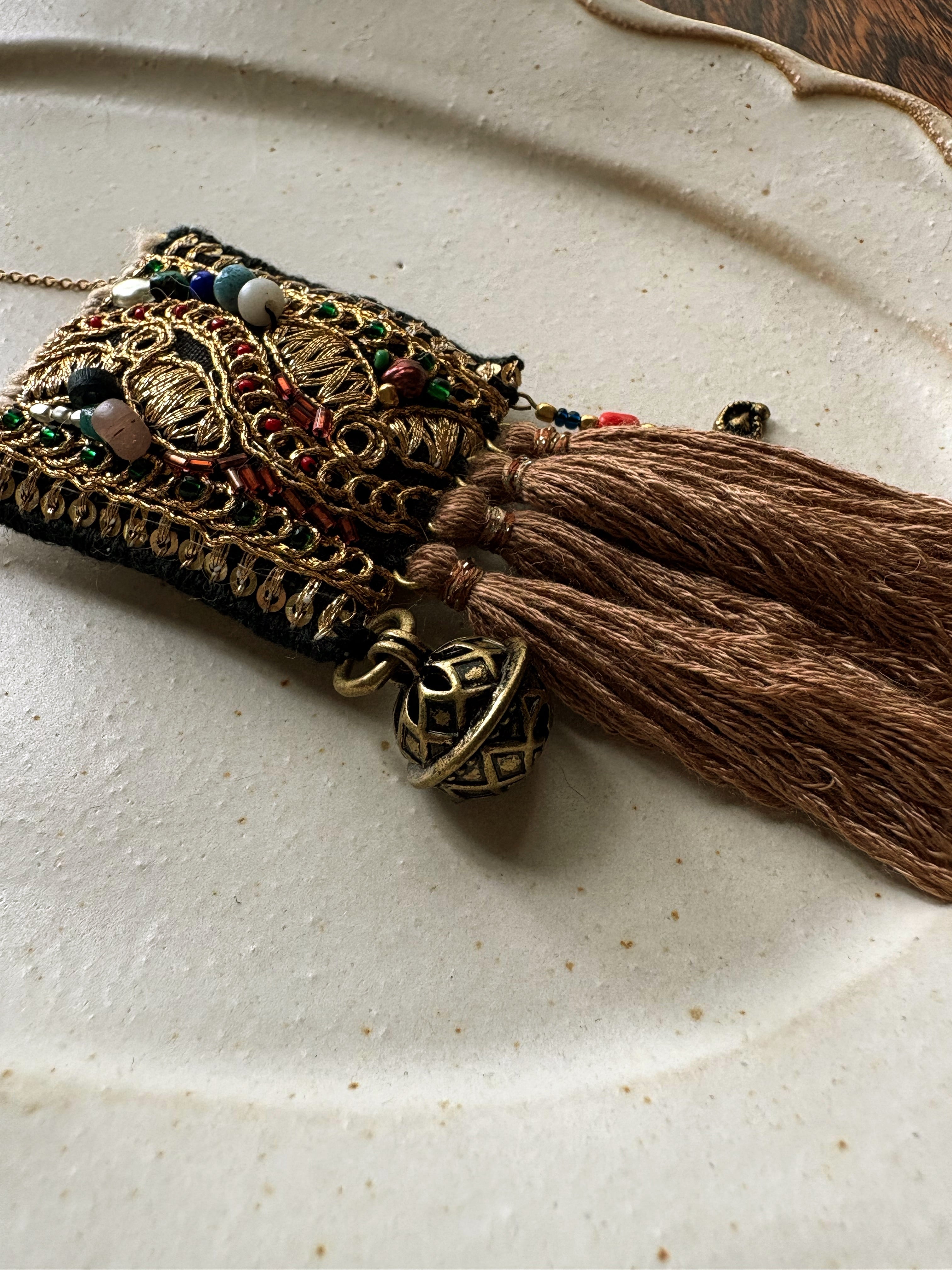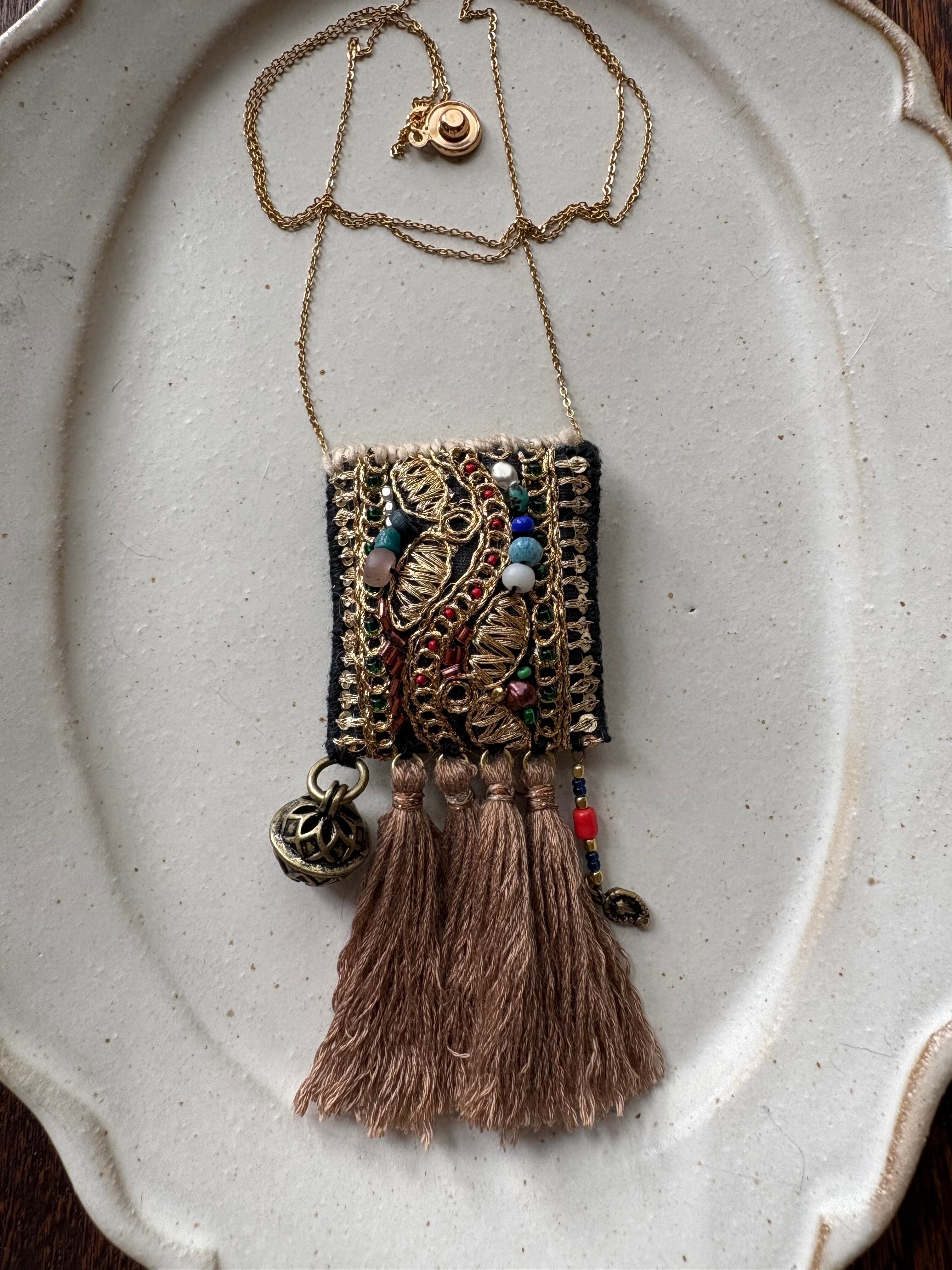黒地にゴールドの刺繍が華やかなインド製リボンの、ペンダント。ボリュームたっぷりのタッセルやインドの鈴やチャーム、ビーズや鉱石を縫い止めて、桂花オリジナルの作品に仕上げています。
