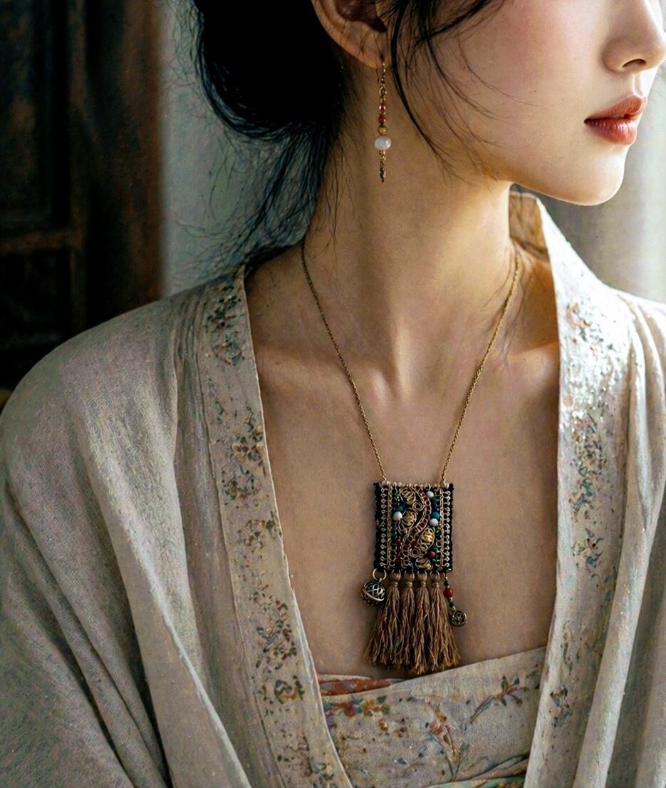 インド刺繍リボンのペンダント(ベージュタッセル)