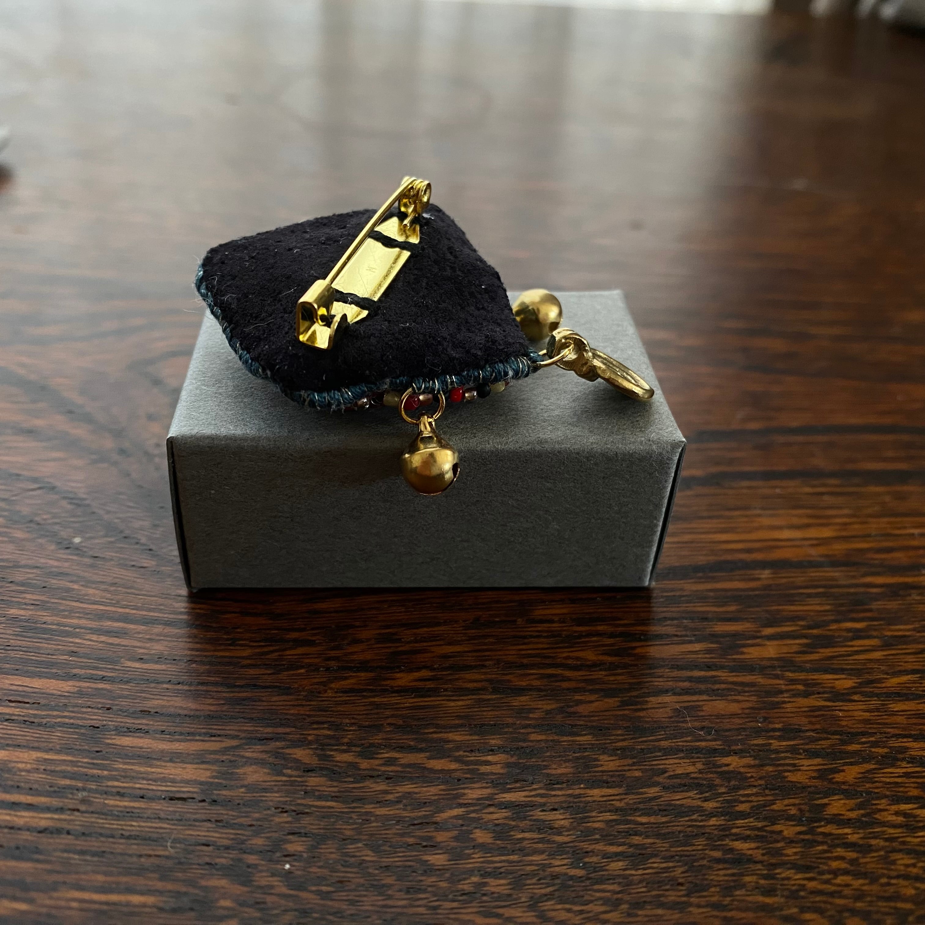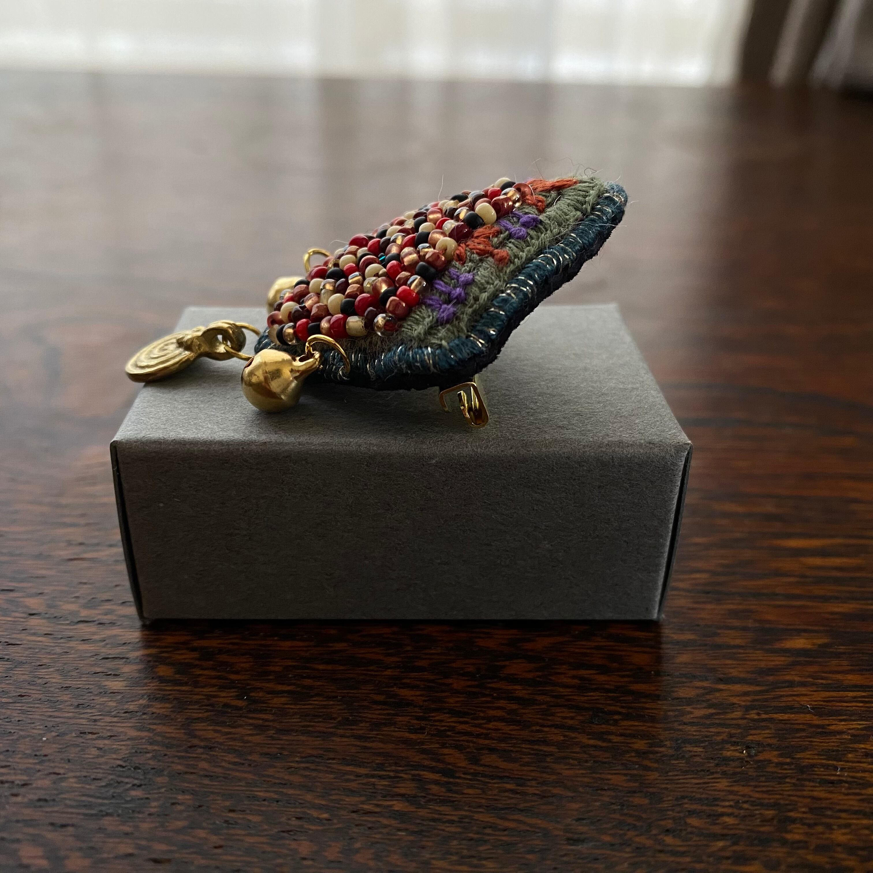 チェコのヴィンテージビーズを贅沢に使い、エキゾチックな色合いの糸で可愛らしい刺繍を施したブローチ。